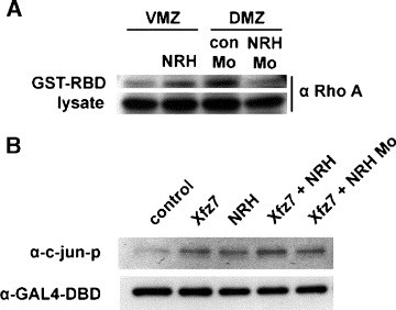 Fig. S2. NRH regulates RhoA activity and JNK activity. (A) NRH mRNA (500 pg) was introduced into VMZs while the con Mo (16.8 ng) or the NRH Mo (16.8 ng) was injected into DMZs. One hundred explants were isolated at stage 10.5 and used in the pull-down assay as described ( Habas et al., 2003 and Ren et al., 1999). NRH mRNA introduced VMZ cells showed up-regulation of RhoA activity, which is almost quiescent in uninjected VMZ cells. NRH Mo introduced DMZ cells exhibited down-regulation of RhoA activity, which is much highly activated in DMZ cells. (B) Using AC cells, we investigated whether NRH could induce JNK activation. NRH (500 pg), Xfz7 (400 pg), and NRH Mo (16.8 ng) were co-injected with GAL4-DBD (100 pg) into the two blastomeres at the 2-cell stage as described (Kinoshita et al., 2003). At the blastula stage, animal cap cells were isolated and immediately processed for western blotting. Anti-phosphorylated c-Jun antibody (rabbit) and anti-GAL4 antibody (mouse) were used to detect JNK activation. |