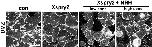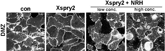 Fig. S5. Xspry2 seems to negatively function in filopodia formation. Xspry2 (500 pg) expressing dorsal cells exhibited filopodia perturbation. Co-expression with Xspry2 and lower concentration of NRH in DMZ cells showed partially rescued filopodia. Interestingly, when higher concentration of NRH was co-expressed, we could observe not only filopodia formation but also other phenotypes like cell�cell or cell�matrix interactions or adhesions. These interactions or adhesions seemed to be weakened as we observed round shaped and sometimes detached single cell during confocal microscopy. Such phenotypes were further enhanced under the presence of Xspry2, suggesting Xspry2 and NRH might be related to cell�cell interaction or cell�matrix adhesion. |