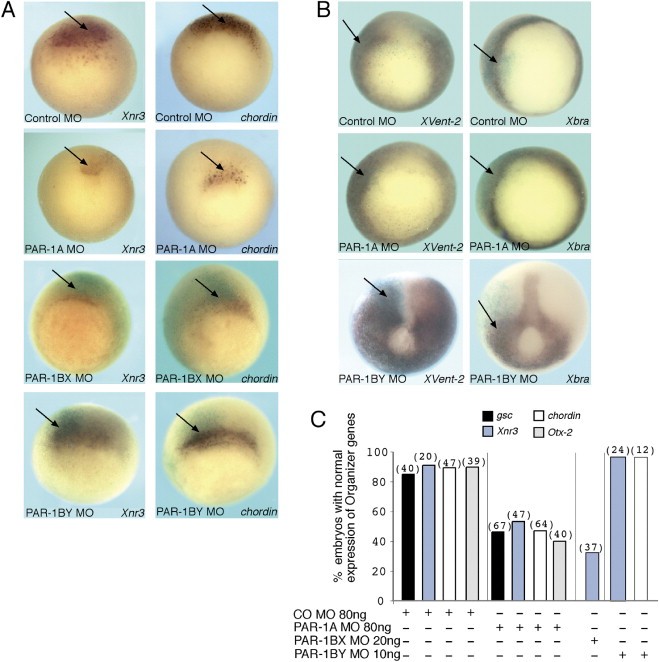 Figure 3. PAR-1A and PAR-1BX but Not PAR-1BY Depletion Reduces Expression of Organizer Genes(A) PAR-1A and PAR-1BX MOs inhibit organizer-specific expression of Xnr3 and chordin while Control MO and PAR-1BY MO do not. Embryos were injected with the amount of MO per embryo given in panel (C) at the 4-cell stage in both dorsal blastomeres. Arrows indicate the approximate injection site; light blue stain visible in some panels is due to staining for coinjected of βGal RNA (50 pg) used as a lineage tracer.(B) Control MO, PAR-1A MO, and PAR-1BY MO have little effect on expression of ventrolateral marginal zone marker gene Xvent-2 or pan-mesodermal marker Xbra. Embryos are shown in vegetal view, dorsal at the top at stage 10.5â11, except for PAR-1BY MO-injected embryos in (B), which are stage 12.(C) Penetrance of the effects of PAR-1 MOs on organizer genes assayed in situ, including goosecoid and Otx-2 as well as those shown in (A). Doses of PAR-1 MOs are shown at the bottom of the histogram are per embryo. Control MO does not noticeably affect development of these markers. Numbers of injected embryos are shown above the bars.