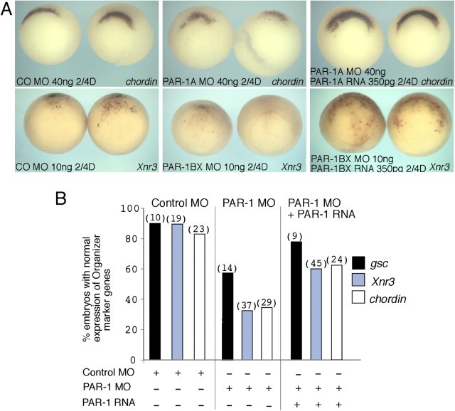 Figure 4. Rescue of the Inhibition of Organizer Gene Expression in PAR-1-Depleted Embryos by PAR-1 mRNA(A) Organizer gene inhibition by PAR-1 MOs rescued by corresponding RNA injection. Embryos were injected with the indicated MOs as in Figure 5 with or without 350 pg per blastomere of the indicated MO-resistant myc-tagged RNAs. Stage 10.5â11 embryos are shown in vegetal view, dorsal at the top. PAR-1 RNA injection results in the modest expansion of their expression domain (right) relative to controls.(B) Quantitation of rescue of PAR-1 MO-induced inhibition of organizer marker genes by PAR-1 mRNA. Expression of gsc and chordin was analyzed in embryos injected with PAR-1A MO (40 ng per blastomere), and expression of Xnr3 was analyzed in PAR-1BX MO-injected samples (10 ng per blastomere). The corresponding PAR-1 mRNA was injected at 350 pg per blastomere.
