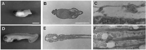 Note striated muscles in F, which was not observed in the early-deleted embryos (see for example, C). Bar in A for A and D: 1 mm. Bar in B