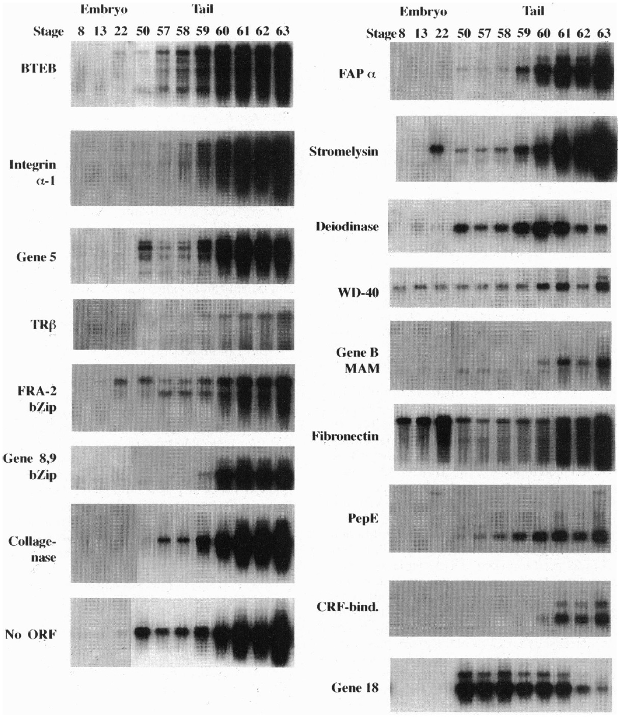 Fig. 1. Developmental RNA blots for 16 of the 17 up-regulated genes and one of the 4 down-regulated genes (gene 18). The first three lanes are blots of total embryo; the remaining lanes were from tail extracts (7). Stage numbers were assigned according to Nieuwkoop and Faber (8). ORF, open reading frame.