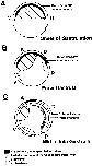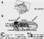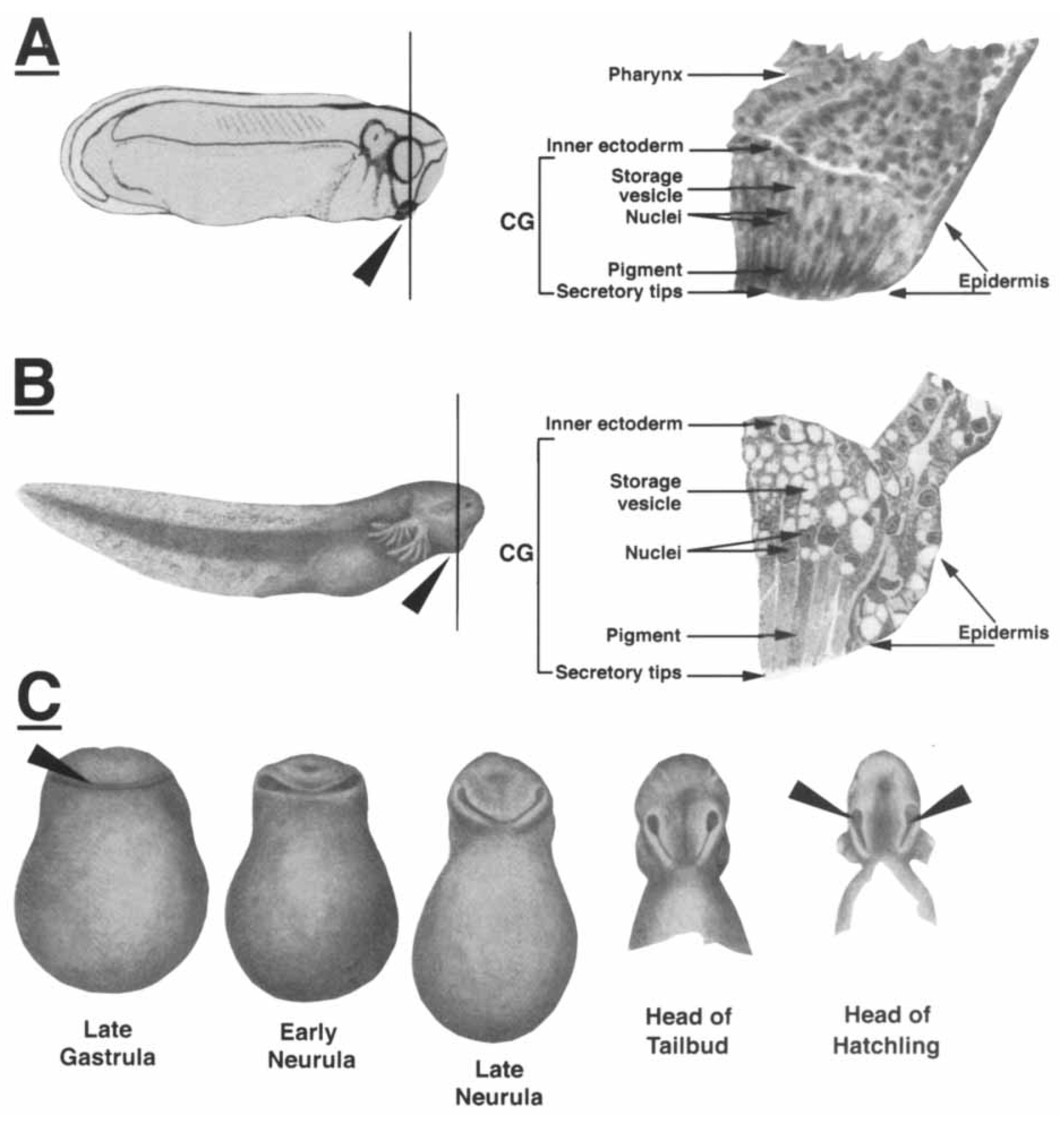 Fig. 1. Morphology, histology, and morphogenesis of the anuran cement gland. A: The Xenopus laevis cement gland. Xenopus embryos have a single conical cement gland. A whole tailbud stage embryo is shown on the left (redrawn from Nieuwkoop and Faber, 1967). Arrowhead: cement gland. A longitudinal section through half of the cement gland is shown on the right. Plane of section is shown on whole embryo. Inner ectoderm: the inner layer of the ectoderm beneath the cement gland. Redrawn from Lyerla and Pelizzari (1976). CG: the length of cement gland cells. Storage vesicle: contains lipids. Epidermis: the outer layer of the ectoderm covers the cement gland cells leaving only the secretory tips uncovered. 6: The cement glands of Rana plafyrrhinus and R. esculenta are bifurcated. A whole R. plafyrrhinus embryo at hatching stage is shown on the left, and on the right a longitudinal section through half of one of the cement glands of its close relative R. esculenta. Plane of section is shown on whole embryo. Redrawn from Lieberkind, 1937. Arrowhead: Cement gland. C: Development of cement glands in R. esculenfa, on which Johannes Holtfreter did much of his work. The cement gland primordium begins as a pigmented patch of cells which invaginate to form a V-shaped groove through which the elongated cement gland cells project. By hatching stage, the cement gland has completely separated into a paired organ. Arrowheads indicate the position of the cement gland. Redrawn from Lieberkind (1937).