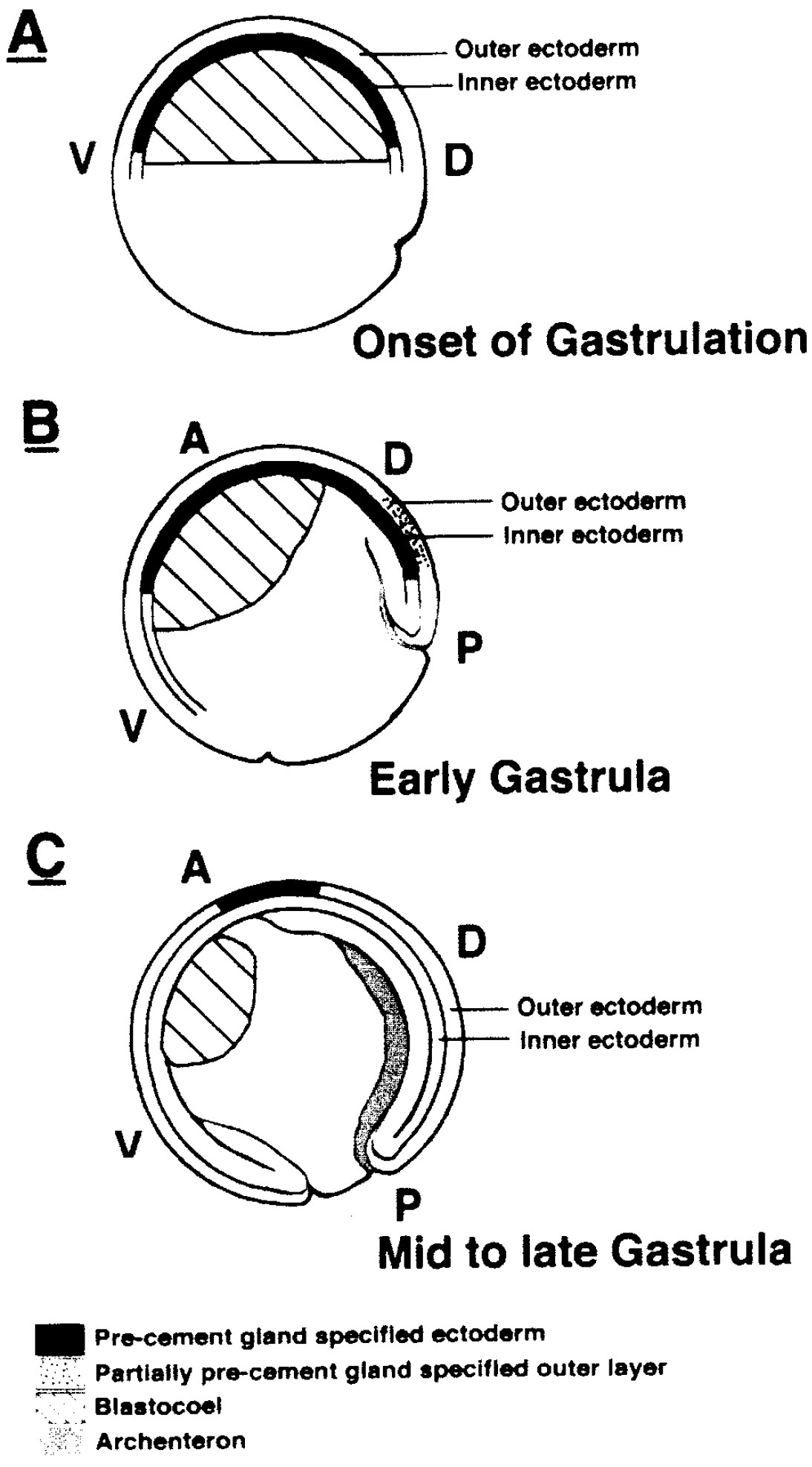 Fig. 3. Timing of Xenopus cement gland specification. Using specification assays, where ectoderm is explanted from the embryo at various stages and allowed to differentiate in culture, the following conclusions can be reached regarding timing of cement gland induction. See Timing of Cement Gland Induction in the text for discussion. A: At the onset of gastrulation the inner layer of the ectoderm is specified as pre-cement gland, both dorsally and ventrally. V: ventral. D: dorsal. B: By early gastrula, in addition to continued cement gland specification in the inner layer, the outer dorsal ectoderm is weakly specified as cement gland. A: anterior. P: posterior. C: At mid to late gastrula the cement gland primordium is specified in the outer layer of the anterior dorsal ectoderm, while the inner layer of the dorsal ectoderm has lost this specification and presumably been reprogrammed towards a neural fate