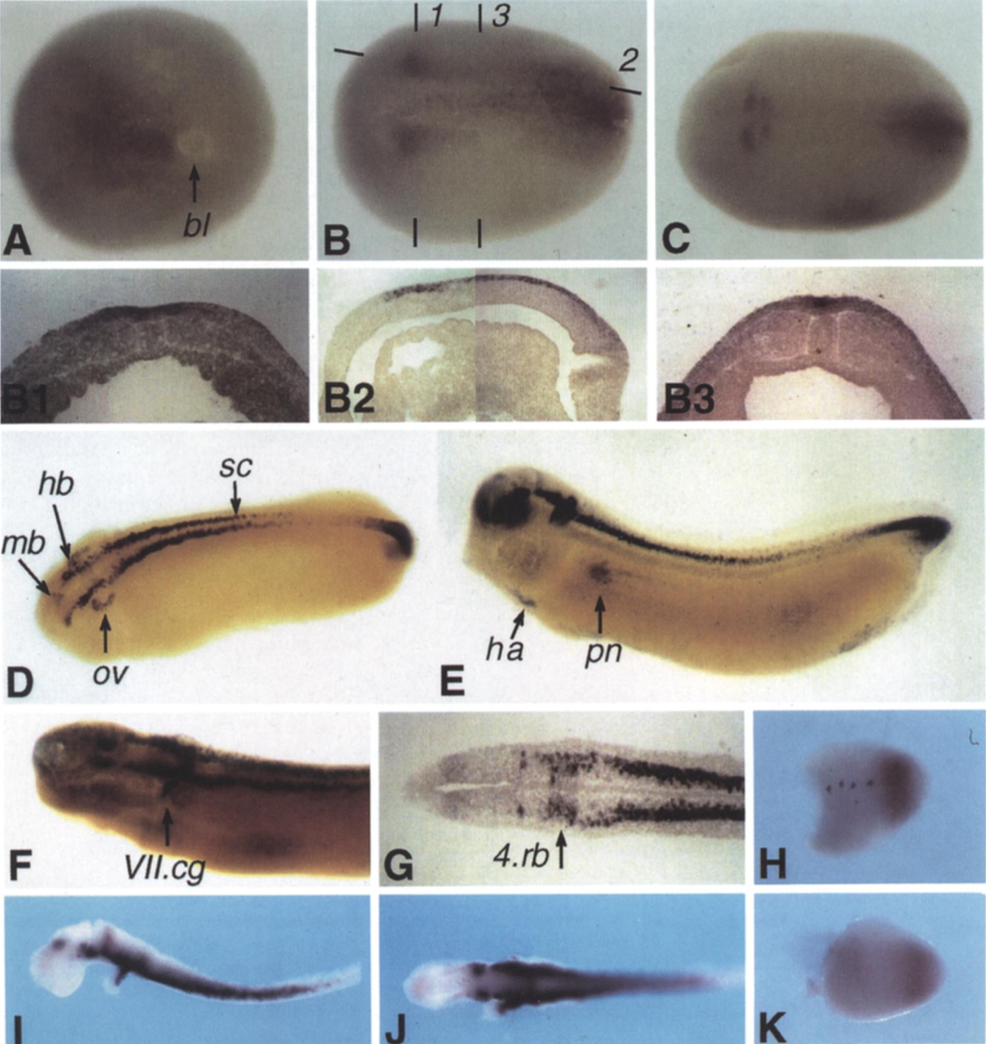 Fig. 5. Expression pattern of Xsal-I during development using whole-mount in situ hybridization and sections of stained embryos. (A) Dorsal/posterior view of an embryo at stage 121/2. Staining is detected in the posterior neural plate and the region of the prospective neural folds. The arrow indicates the closing blastopore. (B) Dorsal view of an embryo at stage 15. Staining is confined to two parallel stripes within the neural groove and two broader stripes that run along the neural folds. At the anterior border of the latter stripes staining extends more laterally. No staining is observed anterior of the prospective midbrain. The short lines numbered 1-3 indicate the plains of vibratome sections shown in B1-B3. (B1) Transversal section of the embryo shown in (B). At the level of the lateral stripes staining is detected in the epithelial as well as in the sensorial layer of the neuroectoderm. (B2) Parasagittal section of an embryo at stage 15. In the anterior part of the Xsal-1 expression domain the epithelial as well as the sensorial layer of the neuroectoderm are stained. Note the sharp anterior border of the expression. (B3). Transverse section of the embryo shown in (B) at the level of the future spinal cord. Staining is confined to the epithelial layer of the neuroectoderm. (C) Dorsal view of an embryo at stage 18. Staining is prominent in two discrete lateral pairs of stripes at the anterior border of expression in the midbrain/hindbrain region. Staining of the neural plate dorsally of the blastopore is more diffuse. (D) Dorso/laterai view of an embryo at stage 27. A cleared embryo is shown. Staining is confined to two parallel stripes in the midbrain (mb), hindbrain (hb), and the spinal cord (sc) Outside the CNS transient staining is observed in the ventral part of the otic vesicle (ov). (E)Lateral view of an embryo at stage 31. A cleared embryo is shown. Prominent staining is seen in the midbrain, hindbraln, spinal cord, the ganglion of the VIIth cranial nerve, and the tail tip. Staining in the tail tip is more diffuse. Weaker staining is detected in the frontal part of the forebraln and in the heart anlage (ha), the pronephros (pn) and the pronephric duct. (F) Dorso/lateral view of an embryo at stage 31. The arrow indicates the position of the VIIth cranial ganglion (VII.cg) that is stained by Xsal-1. Note the transverse stripe within the hindbrain at the level of the otic vesicle and the lack of staining at the midbrain/hindbraln boundary. (G) Horizontal vibratome section of a stained embryo at stage 31. Staining in the midbrain and spinal cord is defined to the lateral parts. The arrow points to the position of the fourth rhombomere (4.rb). The plain of section was chosen to show the extent of the transverse stripe within the hindbrain. The weak expression further rostrai corresponds to the expression within the forebrain as seen in (E,I). (I,H) Isolated brain and spinal cord of an embryo at stage 32. (1) Lateral view, anterior is left, (J) ventral view, the VIIth cranial ganglion of the left side has been removed. (H,K) Isolated hind limb buds of an embryo at stage 52, anterior is left. (H) left and (K) right bud. Xsal-I staining is found