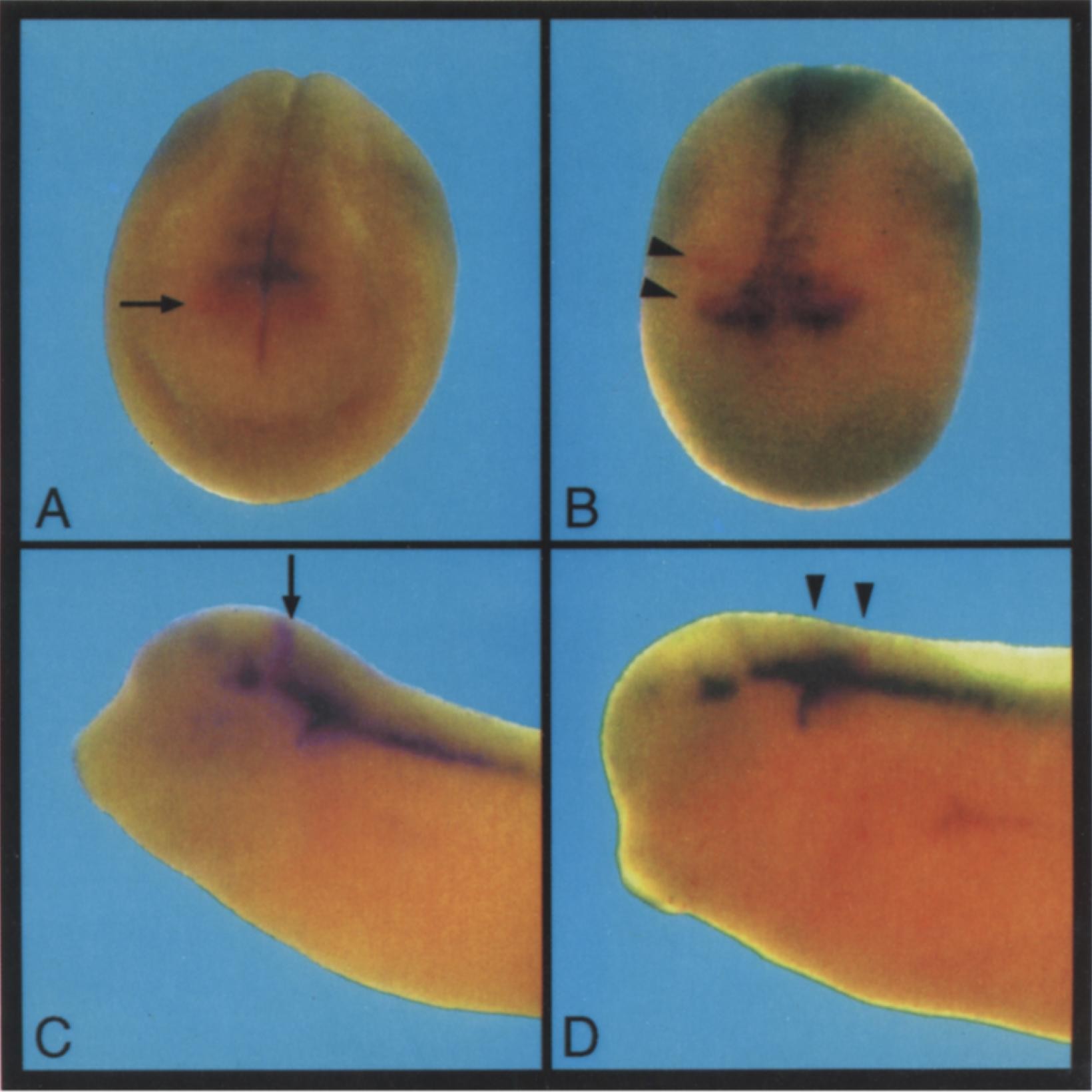 Fig. 6. Spatial relationship of Xsal-1 expression to the expression of En-2 and Krox-20 using whole-mount in situ double staining. (A) Anterior view of an embryo at stage 19 double stained with Xsal-1 (dark blue) and En-2 (red, arrow). En-2 demarcates the future midbrain/hindbrain boundary. (B) Anterior/dorsal view of an embryo at stage 17 double stained with Xsal-1 (darkblue) and Krox-20 (red) Xsal-1 and Krox-20 show an alternating pattern of expression with some overlap of the posterior parts of the Xsal-1 stripes with the anterior parts of the respective Krox-20 stripes. The Krox-20 domains are marked by arrow heads. (C) Lateral view of an embryo at stage 28 double stained with Xsal-1 (darkblue) and En-2 (red, arrow). Note that the Xsal-1 expression is interrupted at the midbrain/hindbrain boundary marked by the En-2 stripe. (D) Lateral view of an embryo at stage 31 double stained with Xsal-1 (darkblue) and Krox-20 (red). The arrowheads point to the Krox-20 expression in rhombomeres three and five.