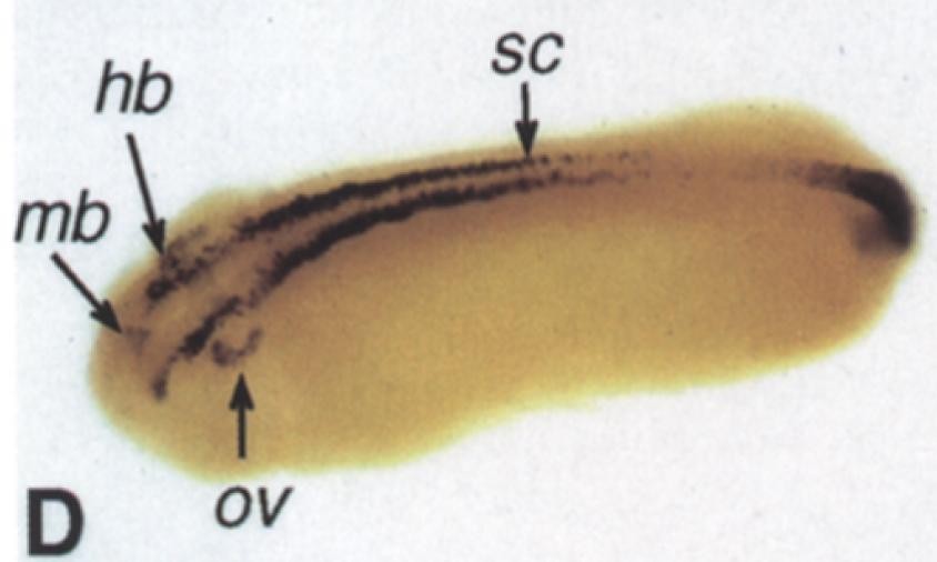 sall3 ( sal-like 3 ) gene expression in Xenopus laevis embryos, NF stage 31, as assayed by in situ hybridization. Dorso-Lateral view: anteriorleft, dorsal up (rotated slightly down along long axis of embryo).