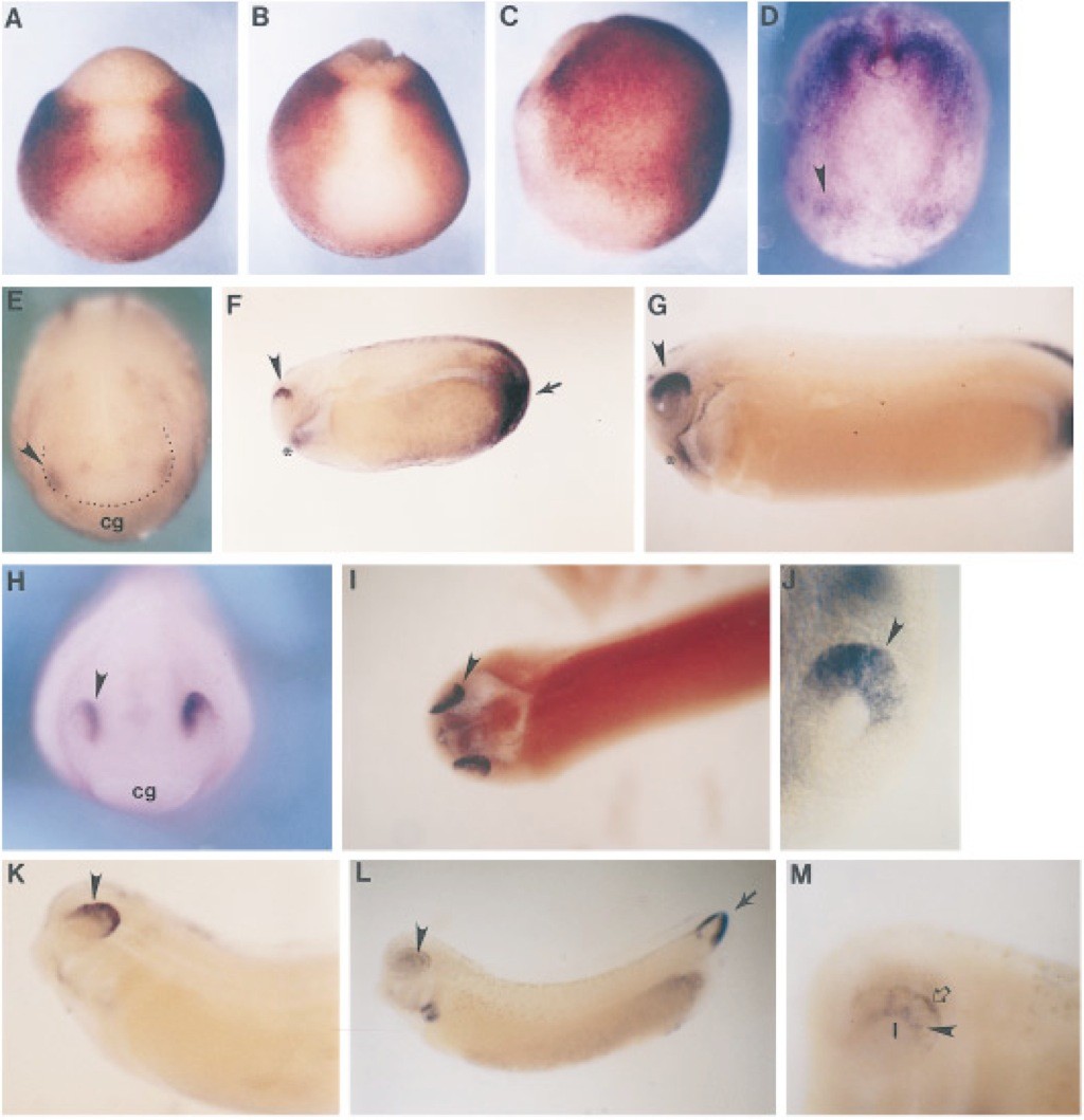 FIG. 2. Whole mount in situ hybridization showing expression of Xbr-1 during development. In panels D Xbr-1 expression in the eye anlage is marked with an arrowhead. (A, B) Xbr-1 expression of stages 10.5 and 11.5 gastrulae. Shown are dorsal views and the closing blastopore is at the top. Xbr-1 is not expressed on the dorsal side. (C) Lateral view of the embryo in (B), showing that Xbr-1 expression is strong on the ventral side of the gastrula. At mid-gastrulation (stage 11.5, B), the Xbr-1 negative area has a keyhole shape, i.e., it is narrow posteriorly and flares out anteriorly. Based on its location on the dorsal side we suggest that the area that does not express Xbr-1 at stage 10.5 corresponds to the prospective neural plate. However, the fate map of the early gastrula shows that the prospective neural plate is much larger and it extends well to the lateral sides of the gastrula (Keller et al., 1992). Therefore, it is likely that the Xbr-1-negative region covers only part of the neural plate, possibly the ventral neural tube and/or the floor plate posteriorly and the prospective forebrain anteriorly. (D) Dorsal-anterior view of Xbr-1 expression at late gastrula/early neurula stage (stage 13). The remnant of the blastopore is to the top and the prospective anterior neural plate to the bottom of the figure. The color reaction has been purposely overdeveloped to reveal the bilateral Xbr1 staining in the anterior neural plate, in the area of the prospective eyes. (E) Anterior view of Xbr-1 expression at the neural plate stage (stage 16). Xbr-1 is expressed in the dorsal eye anlage in the anterior-lateral neural plate. The dotted line defines the limits of the anterior neural plate. (F, G) Side views of Xbr-1 expression at stage 25 (F) and stage 26 (G). Arrow in F points to Xbr-1 expression in the tailbud, asterisk to expression in the pharynx. (H, I) Frontal (H) and dorsal (I) views of stage 27 embryos, showing strong expression in the eye. (J) High magnification of a stage 25/26 eye. Xbr-1 expression is restricted to the dorsal half. (K, L) Side views of stage 30 (K) and stage 33/34 (L) embryos. Arrow in L points to the tailbud. At stage 33/34 the hybridization signal in the eye is obscured by eye pigment. However, in high magnification (M) of the eye region the bluish hybridization signal of Xbr-1 expression (arrowhead) can be distinguished from the brown eye pigment (open arrow). The position of the lens is marked (l). Expression of Xbr-1 is still found only in the dorsal half of the eye but it is more restricted than earlier (compare with M). Abbreviations: cg, cement gland; l, lens. |