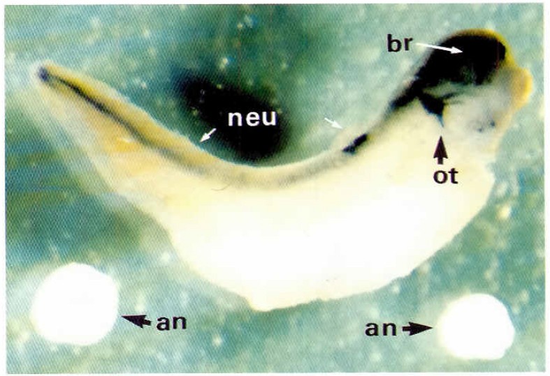 preparation with the neural-specific marker np 187 (control embryo). (Dissertation C. Schiiren, Essen). IB) Exogastrula, which shows the marker not