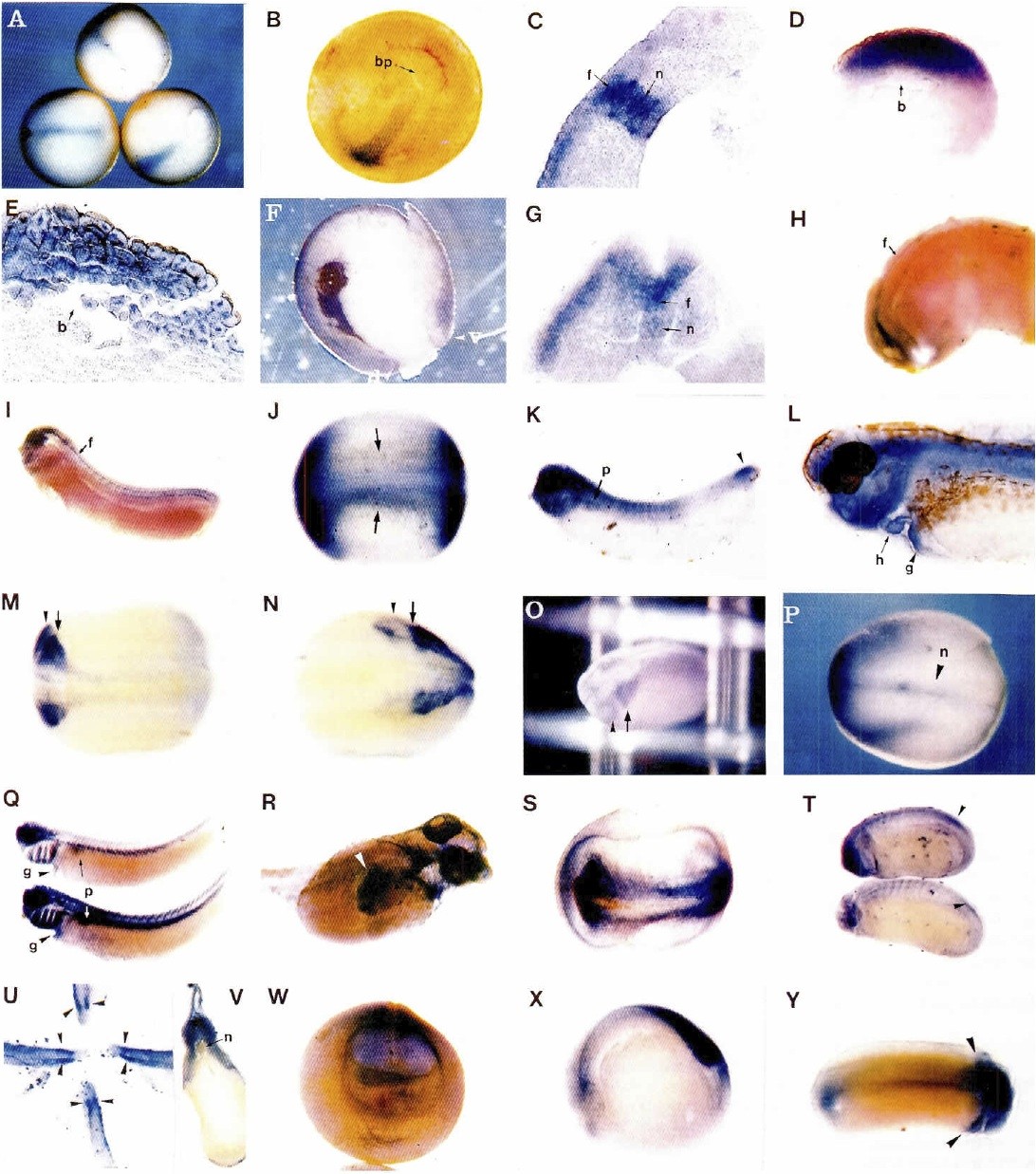 Fig. 5. localization of XFD gene transcripts in Xenopus embryos by whole-mount in situ hybridization. XFD-1: embryos at gastrula (stage 11) [A,B] and transverse section through an embryo at early neurula (srage 13) [C]. XFD-2: blastula (stage 8) embryo [D], section through the animal cap [E] and late gastrula (stage 12) embryo [F]. XFD-3: transverse section through an embryo (stage 23) at the anteriorhindbrain region [G]. stage 23 [H] and tai1bud (stage 28) (I) embryos. XFD-4: embryos at stage 16 [J]. stage 32 [K] and stage 37 [L]. Arrows [J] denote pre-somitogenic mesoderm, arrowhead [K] points towards intense staining at the tip of the tail. XFD-6: embryos at stage 17 [M]. stage 19 [N] and stage 23 [O]. Arrows and arrow. heads denote two types of cell populations differentiating to cranial neural crest cells of the hindbrain (arrows) and midbrain (arrowhead). XFD-7: neurula (stage 15) (PI, stage 35 (0) and stage 44 (R) embryos. Arrowhead (R) points at localized transcription in a defined area of the gut at the right side of the embryo XFD-9: Embryos at stage 16 (S), stage 25 (T). stage 35 [U] and transverse section through a stage 36 embryo [V] at the middle part. Arrowheads in (T) denote the border between segmented and unsegmented somitic mesoderm. arrowheads in (U) point at intense staining near the posterior pole XFD-l0: Neurula (stage 15) embryo [W]. lateral view of a neurula Istage 16) embryo [X] and dorsal view at an embryo at stage 24/25 (Y). Arrowheads in (V) point at a cranial neural crest cells. b, blastocoel; bp, blastoporus; d and v, dorsal and ventral lip of blastoporus; f, neural floor plate; g, foregut; h, heart; n, notochord; p, pronephros.