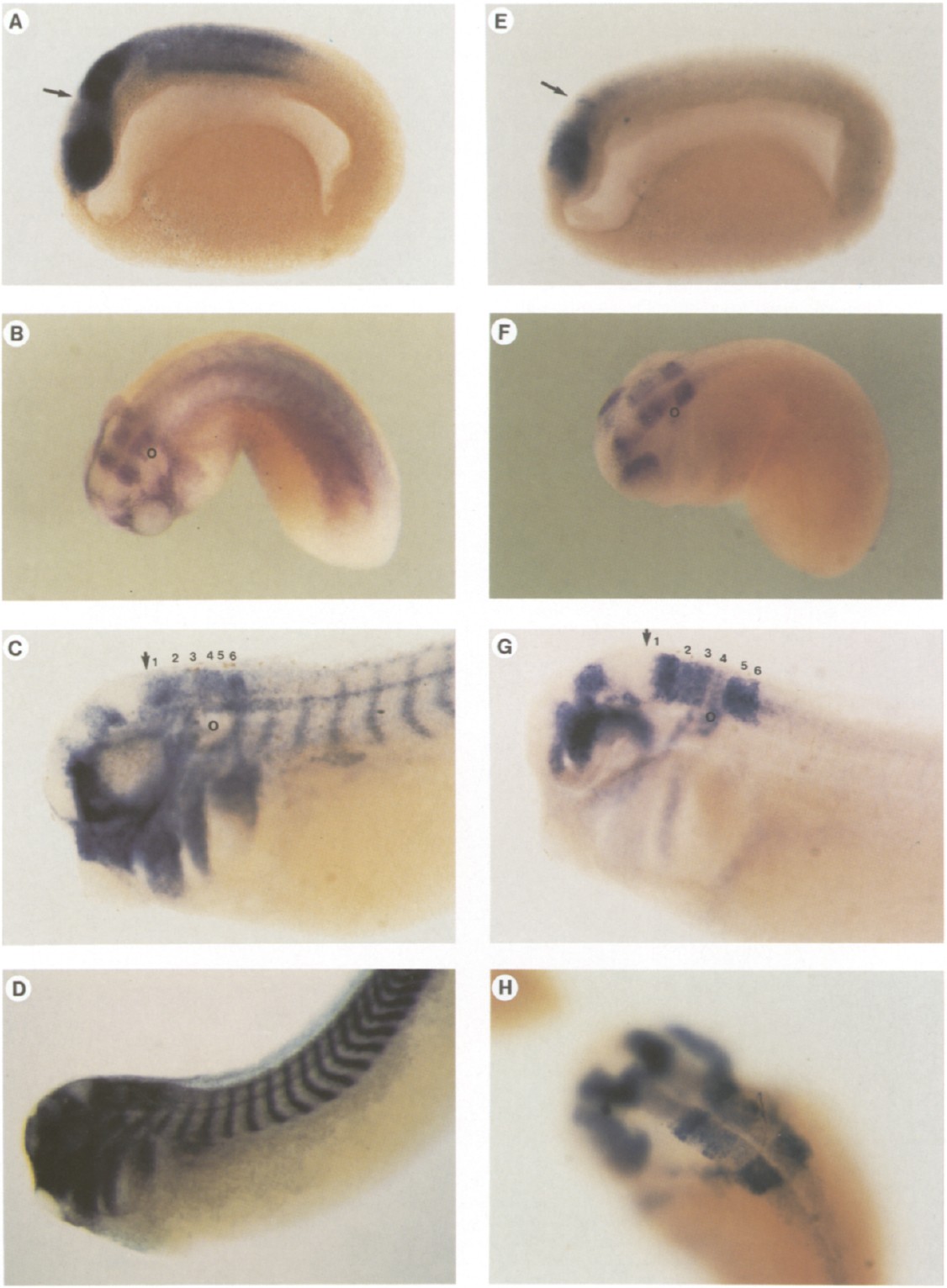 Fig. 4. Whole mount in situ hybridization with an antisense xCOUP-TF-A RNA probe (A-D) and an antisense xCOUP-TF-B RNA probe (E-H). (A)