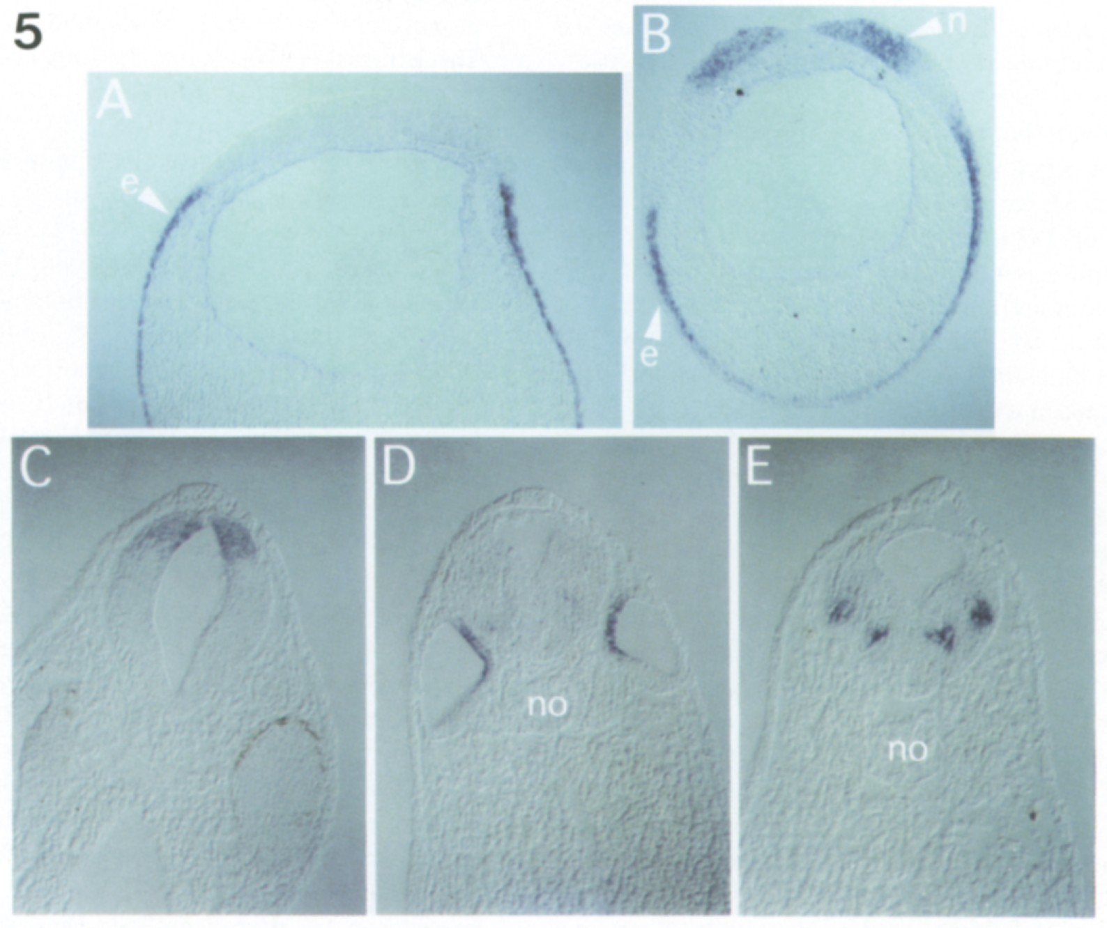 Fig. 5. Histological analysis of Xgbx-2 expression. Embryos were processed for whole-mount in situ hybridization, embedded in Paraplast, and 16pm (A,B) or 10pm (C-E) sections were cut. Dorsal is at the top in all sections except in (A). (A) Horizontal section of a stage 14-15 embryo which is cut anterior to the hindbrain. Note that the anterior neural plate is bent ventralwards at this stage, so that the horizontal section passes through the future forebrain and midbrain, and the lateralepidermis. Anterior is at the top. The anterior border of the epidermal expression (e) lies in the region of the posterior border of the anterior neural plate. (B) Transverse section of a stage 14-15 embryo at a level near the anterior expression border in the neural plate. The section is slightly oblique, such that the left side is more anterior than the tight side. Staining is observed in the thickened neural plate (n) and in the epidermis (e). There is no expression in the dorsal midline. At this stage, the most anterior epidermal expression (left side) appeared to be restricted to the inner (sensorial) layer of the epidermis. Epidermal expression is observed across the ventral midline. (C-E) Transverse sections of the same stage 31 embryo. (C) Section at the level of the anteriorhindbrain. Staining is observed in the dorsal part of the neural tube, but not at the dorsal midline. The section is slightly oblique, such that the ventrolateral expression in the anteriorhindbrain (Fig. 3K) is not visible. (D) Section at the level of the otic vesicle. Expression is found along the medial (inner) side of the dorsal part of the otic epithelium. The notochord (no) is labeled. (E) Section through the posteriorhindbrain. There is staining in two bilaterally symmetric spots in the neural tube.