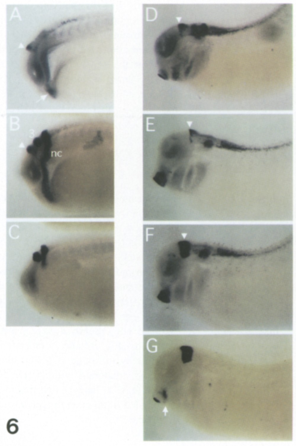 Fig. 6. Localization of Xgbx-2 expression in the hindbrain. Embryos were hybridized alone or in combinations with Xgbx-2, Krox-20, or En-2. For all embryos, a lateral view is shown with dorsal at the top and anterior to the left. The magnification is the same in all photographs. All embryos are cleared. Arrowhead in A, B, D-F: anterior border of Xgbx-2 expression. (A-C) Stage 21. (A) Embryo hybridized with Xgbx-2 alone. Xgbx-2 is also expressed in the headendoderm (arrow). (B) Embryo cohybridized with Xgbx-2 and Krox-20. Note the gap between the Xgbx-2 stripe and the rhombomere 3-stripe (3) of Krox-20, which is a length of approximately one rhombomere. Krox-20 is also expressed in neural crest (nc) migrating into the third visceral arch (Bradley et al., 1992). (C) Embryo hybridized with Krox-20 alone. (DG) Stage 31. (D) Embryo cohybridized with Xgbx-2 and Krox-20. The anterior Xgbx-2 expression border (arrowhead) lies at least 2 rhombomere lengths anterior to the rhombomere 2/3 boundary. (E) Embryo hybridized with Xgbx-2 alone. (F) Embryo cohybridized with En-2 and Xgbx-2. The En-2 stripe does not appear to be widened compared to (G). The anterior border of Xgbx-2 expression (arrowhead) would be predicted to lie approximately halfway into the En-2 expressing region (compare to E). (G) Embryo hybridized with En-2 alone. En-2 is also expressed in the mandibular arch (arrow).