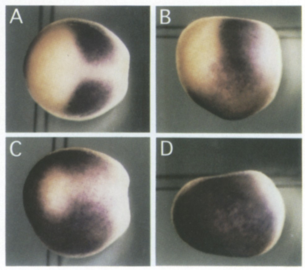 Fig. 4. Comparison of the expression of Xgbx-2 to the expression of Xbra. All three embryos are stage 11 (midgastrula stage). The same magnification is used in all photographs. Shown are dorsovegetal views; future anterior is to the top. (A) Embryo hybridized for Xgbx-2 alone. (B) Embryo hybridized for Xgbx-2 and Xbra. (C) Embryo hybridized for Xbra alone.
