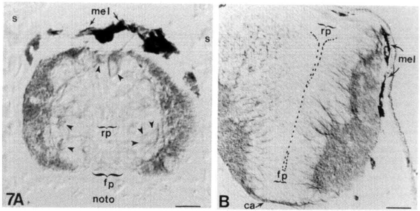 axom (ca). Note the absence of staining in the roof plate (rp) and in