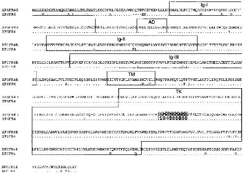 FIG. 1. Comparison of predicted amino acid sequences from XFGFR4B and XFGFR4. Dashes represent gaps in the
