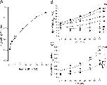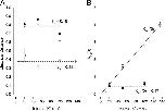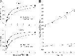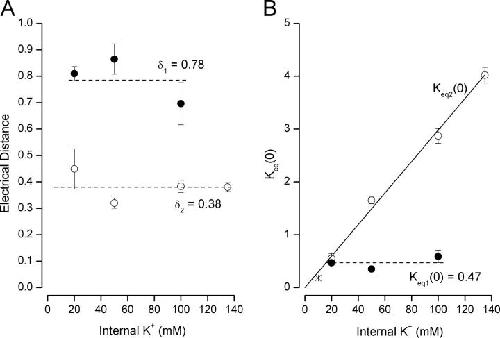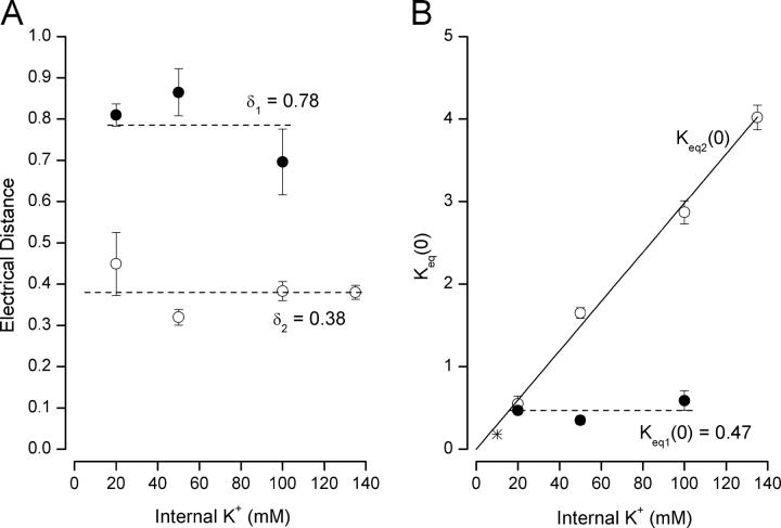Figure 5. . Properties of selectivity filter one-ion and two-ion occupancy modes. Electrical distance and equilibrium values from fits of Eqs. 3a or 3b to the relevant data in Fig. 3. (A) Internal K+ and the electrical distance for one-ion (δ1, •) and two-ion (δ2, ○) occupancy modes. Dashed lines represent the mean of the electrical distance parameters. (B) Internal K+ and the equilibrium values (at 0 mV) for the one-ion (K eq1(0), •) and two-ion (K eq2(0), ○) occupancy modes for internal K+ levels ≥20 mM. * represents K eq2(0) at 10 mM internal K+. The dashed line represents the mean of the K eq1(0) values.