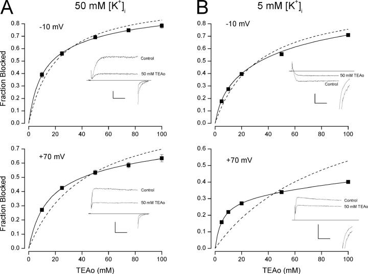 Figure 1. . Low internal K+ reveals two components of external TEA block. Fraction of Shaker K+ channel current blocked by external TEA in 50 mM (A) and 5 mM (B) internal K+ at −10 mV (top) and +70 mV (bottom). Data points are the mean values from 3 to 6 measurements with standard error limits for those whose errors are larger than the symbol size. Insets show raw currents in the absence (Control) and presence of 50 mM external TEA. Calibrations: (A) −10 mV, 50 pA/10 ms; +70 mV, 0.2 nA/10 ms; (B) −10 mV, 50 pA/10 ms; +70 mV, 0.1 nA/10 ms. Dashed lines are fits of Eq. 1 to the data with Kapp values of (A) −10 mV, 20 mM; +70 mV, 43 mM; (B) −10 mV, 32 mM; +70 mV, 89 mM. Solid lines are fits of Eq. 2 to the data with the A, Kapplow, and Kapphigh parameter values shown in Fig. 2.