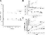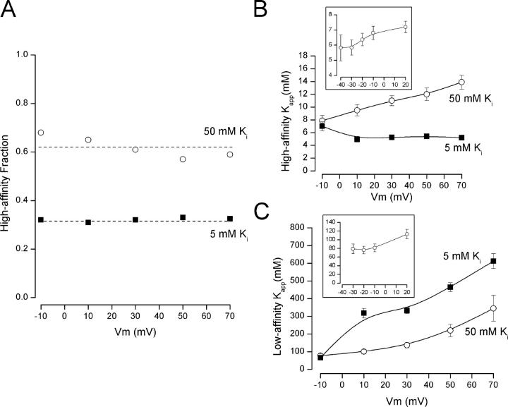 Figure 2. . Voltage dependence of the two components of external TEA block. (A) The fraction of current block by external TEA with high affinity (the parameter A in Eq. 2) at 50 mM (○) and 5 mM (▪) internal K+. (B) The Kapphigh value from Eq. 2 determined in 50 mM (○) and 5 mM (▪) internal K+. (C) The Kapplow value from Eq. 2 determined in 50 mM (○) and 5 mM (▪) internal K+. Insets: Kapphigh and Kapplow values obtained at negative potentials from block of current tails with an activation voltage of +20 mV (see materials and methods). The values at +20 mV were from block of steady-state current during the activation pulse.