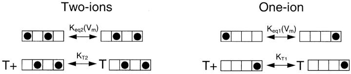 We have examined the voltage dependence of external TEA block of Shaker K(+) channels over a range of internal K(+) concentrations from 2 to 135 mM. We found that the concentration dependence of external TEA block in low internal K(+) solutions could not be described by a single TEA binding affinity. The deviation from a single TEA binding isotherm was increased at more depolarized membrane voltages. The data were well described by a two-component binding scheme representing two, relatively stable populations of conducting channels that differ in their affinity for external TEA. The relative proportion of these two populations was not much affected by membrane voltage but did depend on the internal K(+) concentration. Low internal K(+) promoted an increase in the fraction of channels with a low TEA affinity. The voltage dependence of the apparent high-affinity TEA binding constant depended on the internal K(+) concentration, becoming almost voltage independent in 5 mM. The K(+) sensitivity of these low- and high-affinity TEA states suggests that they may represent one- and two-ion occupancy states of the selectivity filter, consistent with recent crystallographic results from the bacterial KcsA K(+) channel. We therefore analyzed these data in terms of such a model and found a large (almost 14-fold) difference between the intrinsic TEA affinity of the one-ion and two-ion modes. According to this analysis, the single ion in the one-ion mode (at 0 mV) prefers the inner end of the selectivity filter twofold more than the outer end. This distribution does not change with internal K(+). The two ions in the two-ion mode prefer to occupy the inner end of the selectivity filter at low K(+), but high internal K(+) promotes increased occupancy of the outer sites. Our analysis further suggests that the four K(+) sites in the selectivity filter are spaced between 20 and 25% of the membrane electric field.