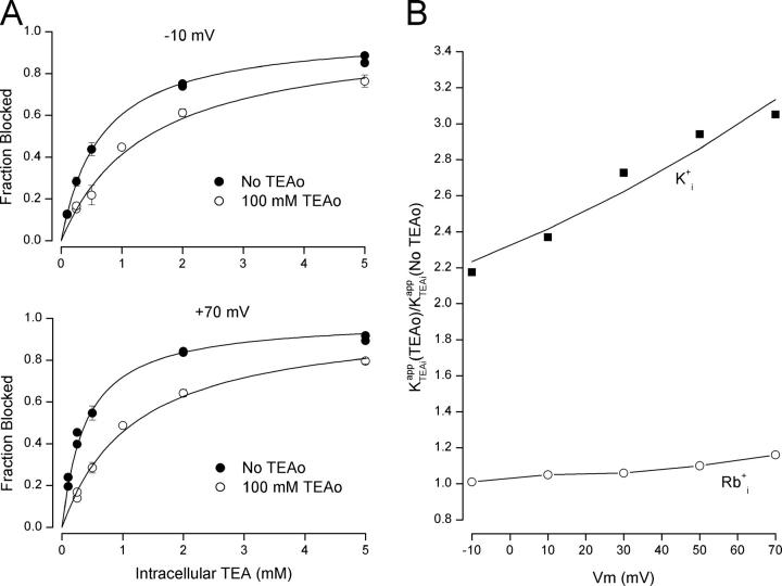 Figure 4. . Determination of the affinity and apparent voltage dependence for K+ binding to an internal site. (A) Fraction of current at −10 mV (top) and +70 mV (bottom) blocked by the indicated internal TEA concentrations in the absence (•) and presence (○) of 100 mM external TEA with 135 mM internal K+. Symbols with standard error limits represent mean values from 3–4 measurements. Symbols without error bars represent individual measurements. Solid lines are fits of Eq. 1 to the data with Kapp values at −10 mV of 0.65 and 1.4 mM and at +70 mV of 0.39 and 1.2 mM in the absence and presence of external TEA, respectively. (B) The ratio of the Kapp values for internal TEA block in the presence and absence of external TEA with 135 mM internal K+ (▪) and with the internal K+ replaced by Rb+ (○). The solid line with the internal K+ data is the best fit of Eqs. 3 and 4 to the data with KK(0) and δ values of 102 mM and 0.17, respectively. The line connecting the Rb+ data has no theoretical meaning.