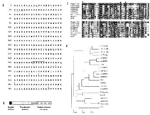 clone is shown. A putative signal sequence is underlined and the potential cleavage site is boxed. Cysteines within the mature domain are marked