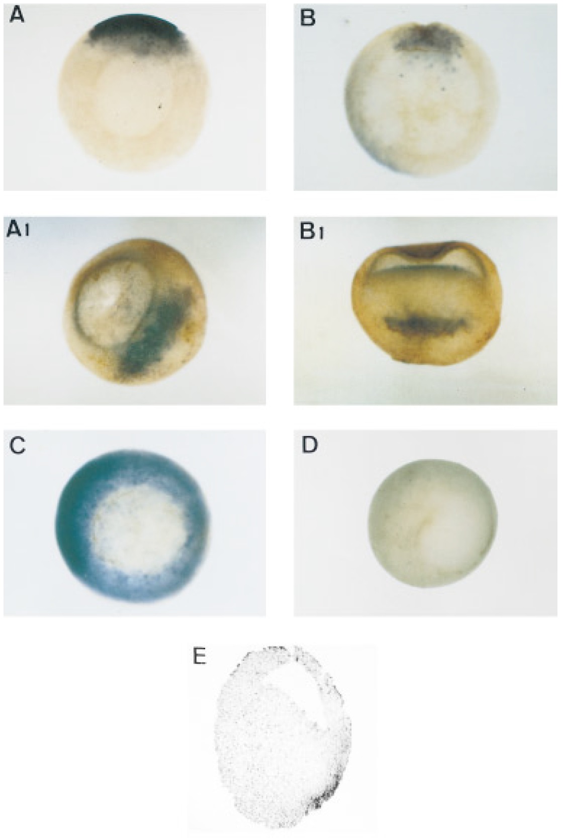 in the Spemann organizer. (A) Albino embryo at late blastula (stage 9), vegetal view; dorsal is up. (A1) Dorsal view. Staining is present in