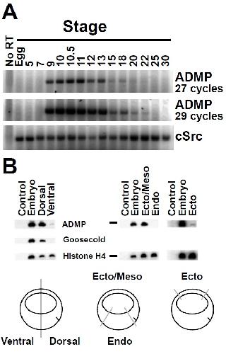 (A) Expression levels of ADMP. RT-PCR with total RNA isolated