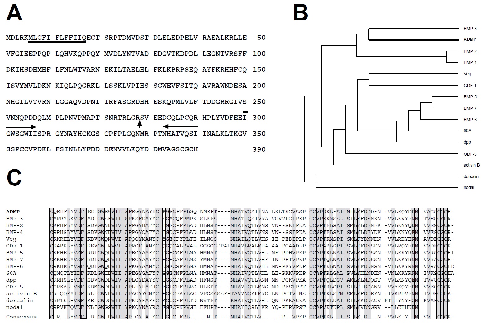 Fig. 1. ADMP is a novel member of the TGF-b superfamily. (A) Deduced amino acid sequence of ADMP. The putative signal sequence is