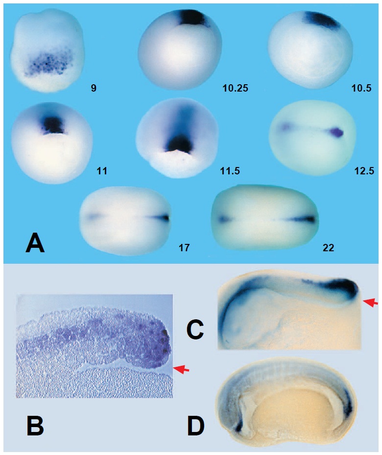 present in the dorsal marginal zone during gastrulation. Stage 10.5