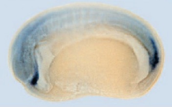 admp (anti-dorsalizing morphogenic protein) gene expression in bisected Xenopus laevis embryo, mid-sagittal section, assayed via in situ hybridization, NF stage 22, lateral view, anteriorleft, dorsal up.
