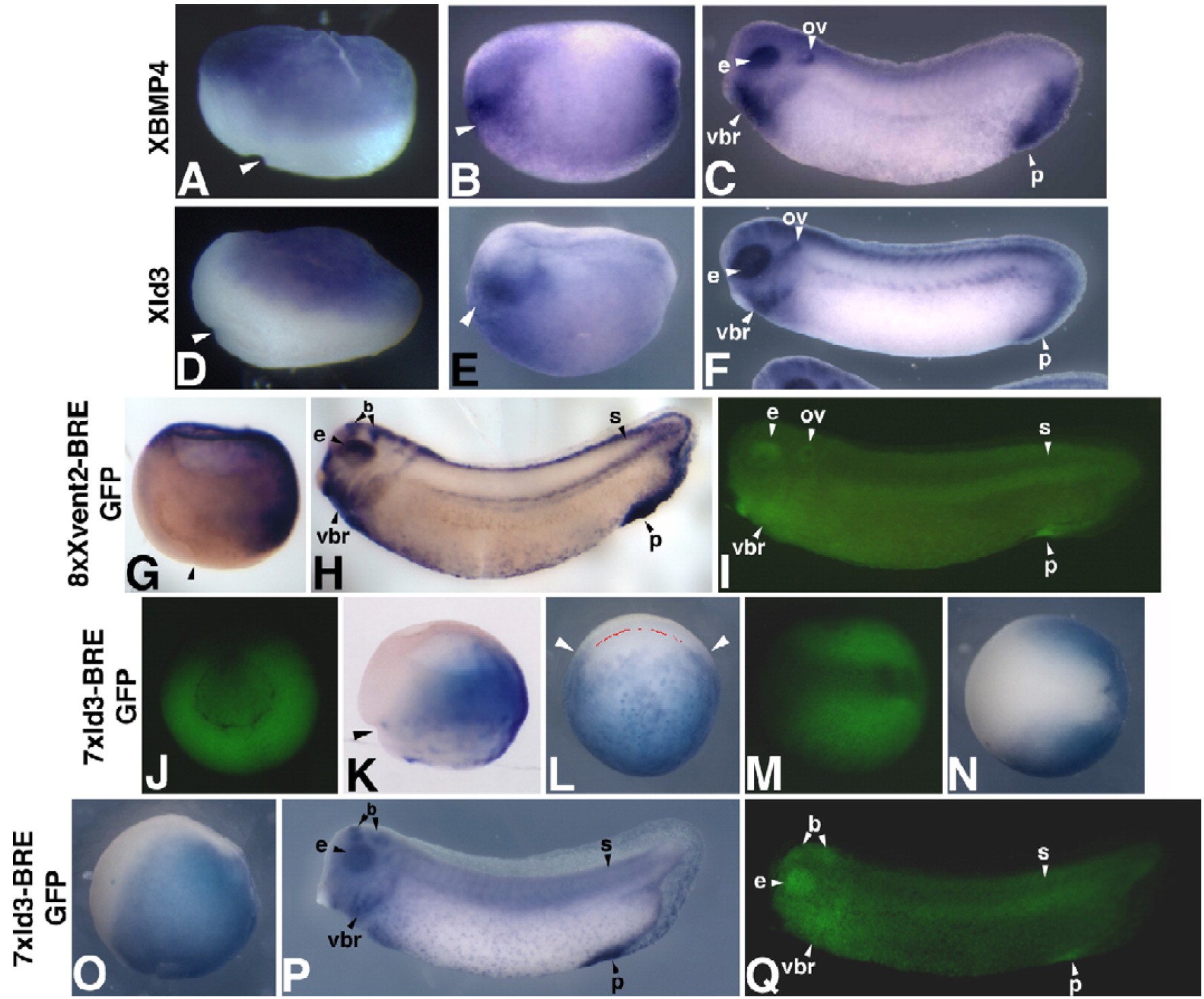 Fig. 6. The Xvent2 and XId3 BREs direct expression of a GFP reporter gene to regions of BMP activity in transgenic frogs. Expression of XBMP4 compared to XId3 expression in gastrula, neurula, and tailbud stage embryos is shown in panels (A) and (DF), respectively. Unless otherwise indicated, for gastrula stages, dorsal is to the left and the animal pole up. For neurula stages, anterior is to the left and dorsal is up. For tailbud stages, lateral views are shown. (A, D) At the gastrula stage (10.5), both genes are expressed in the animal cap and excluded from part of the area above the dorsal blastopore lip (arrowheads). (B, E) At the neurula stage (14 5), both XId3 and XBMP4 are expressed in the future cement gland (arrowhead) and the ventral region. (C, F) At tailbud stages (2728), both genes are expressed in the proctodeum (p), the ventral branchial arch/heart region (vbr), the eyes (e), and the otic vesicle (ov). (G) Expression of the 8xXvent2-BRE/GFP-reporter gene analyzed in transgenic embryos. (G) Gastrula stage embryo (stage 10.511); arrowhead, dorsal blastopore lip. GFP mRNA is expressed on the ventral side only, including the ventral marginal zone and the ventral ectoderm. (H) Stage 32 embryo; stained with antisense GFP mRNA. (I) Stage 32 embryo, showing GFP protein fluorescence of the eye (e), ventral branchial arch/heart region (vbr), otic vesicle (ov), somites (s) and proctodeum (p). (J ) Expression of the 7xId3 BRE/GFP reporter gene in transgenic embryos; (J, M, Q) fluorescence of GFP protein; (K, L, N, O, P) expression of GFP mRNA. (J) Stage 11 embryo, vegetal view, dorsal is up. GFP protein is expressed ventrally and laterally but not dorsally. Note that there is also fluorescence in the yolk plug. (K) Stage 10.5 embryo; arrowhead, dorsal blastopore lip. GFP mRNA expression is excluded from the dorsal side. (L) Stage 10.5 embryo, uncleared, vegetal view, dorsal is up; white arrowheads show the limits of the ventral expression; red line, dorsal blastopore lip. Expression is observed only on the ventral side and in the yolk plug. (M) Neurula stage embryo (stage 14), dorsal view, anterior is to the left. GFP protein fluorescence is excluded from the neural plate. (N) Same embryo as in panel (M), dorsal view, anterior is to the left. GFP mRNA expression is excluded from the neural plate. GFP mRNA appears to be expressed in a slightly smaller domain than that of the GFP protein shown in panel (M) likely to due the fact that some of the mRNA disappears by this stage. (O) Same embryo as in panels (M, N), lateral view. GFP mRNA expression is observed only ventrally and is excluded from the neural plate. (P) Stage 32 embryo, stained with antisense GFP mRNA. (Q) Same embryo as in panel (P), but showing GFP protein expression. |