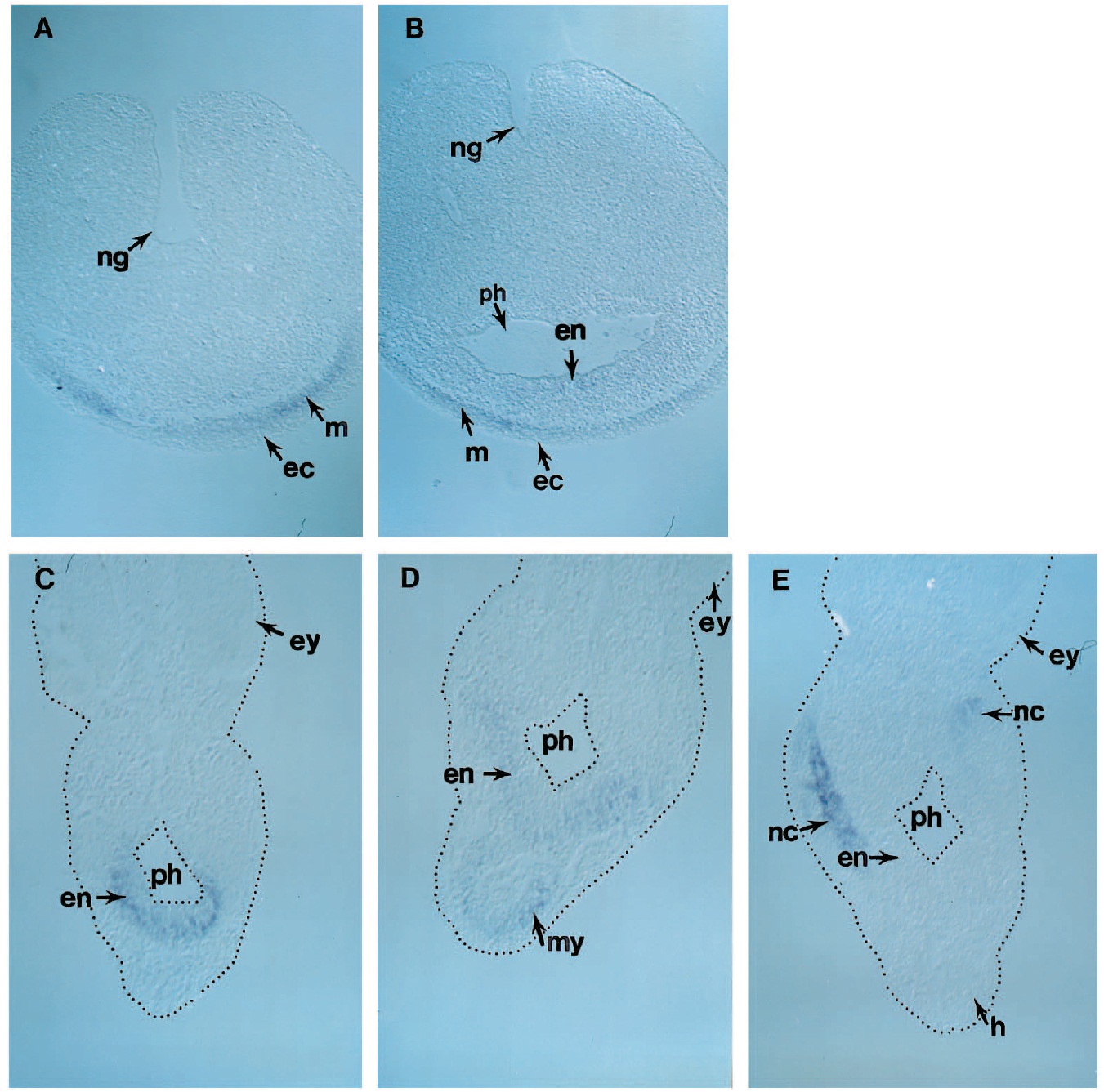 ectoderm; en, endoderm; ey, eye anlage; h, heart region; m,