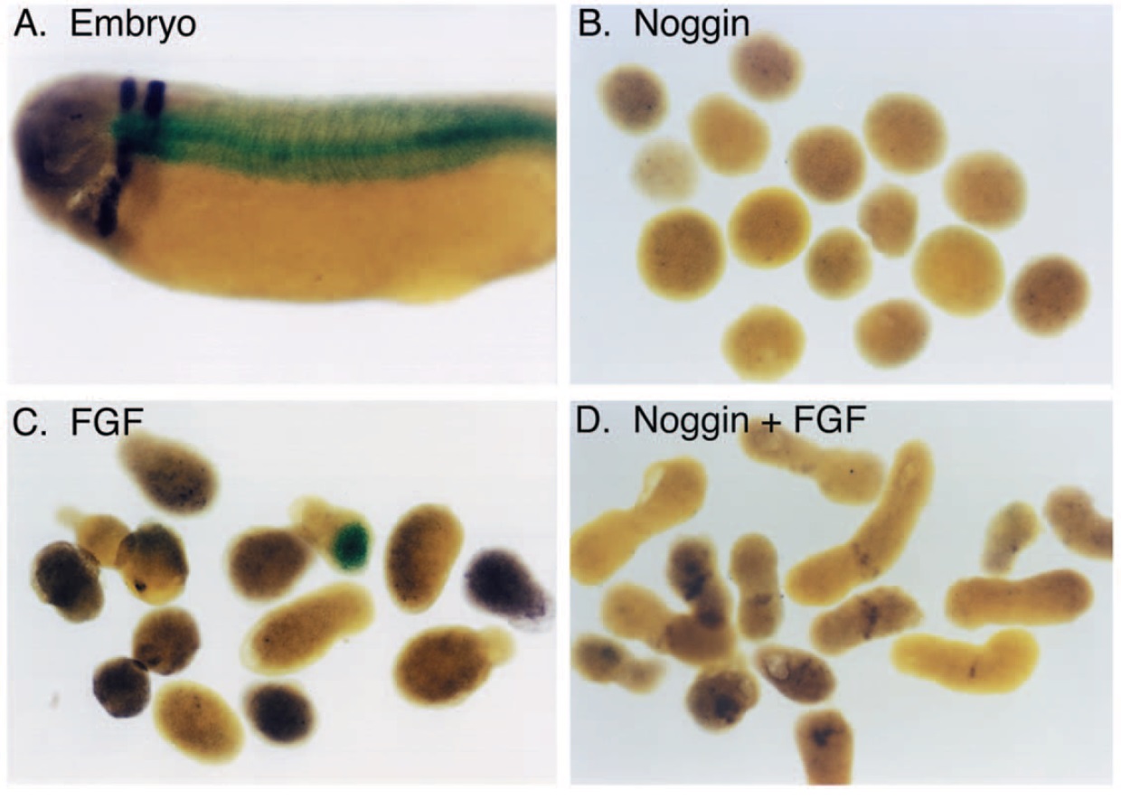 Fig. 3. Noggin + FGF generates neural tissue with anterior-posterior polarity. Ectoderm from stage 10.25 embryos was treated with increasing