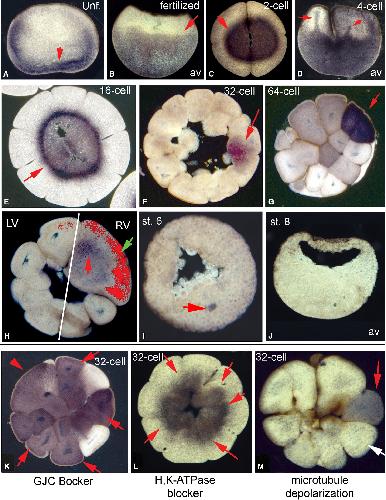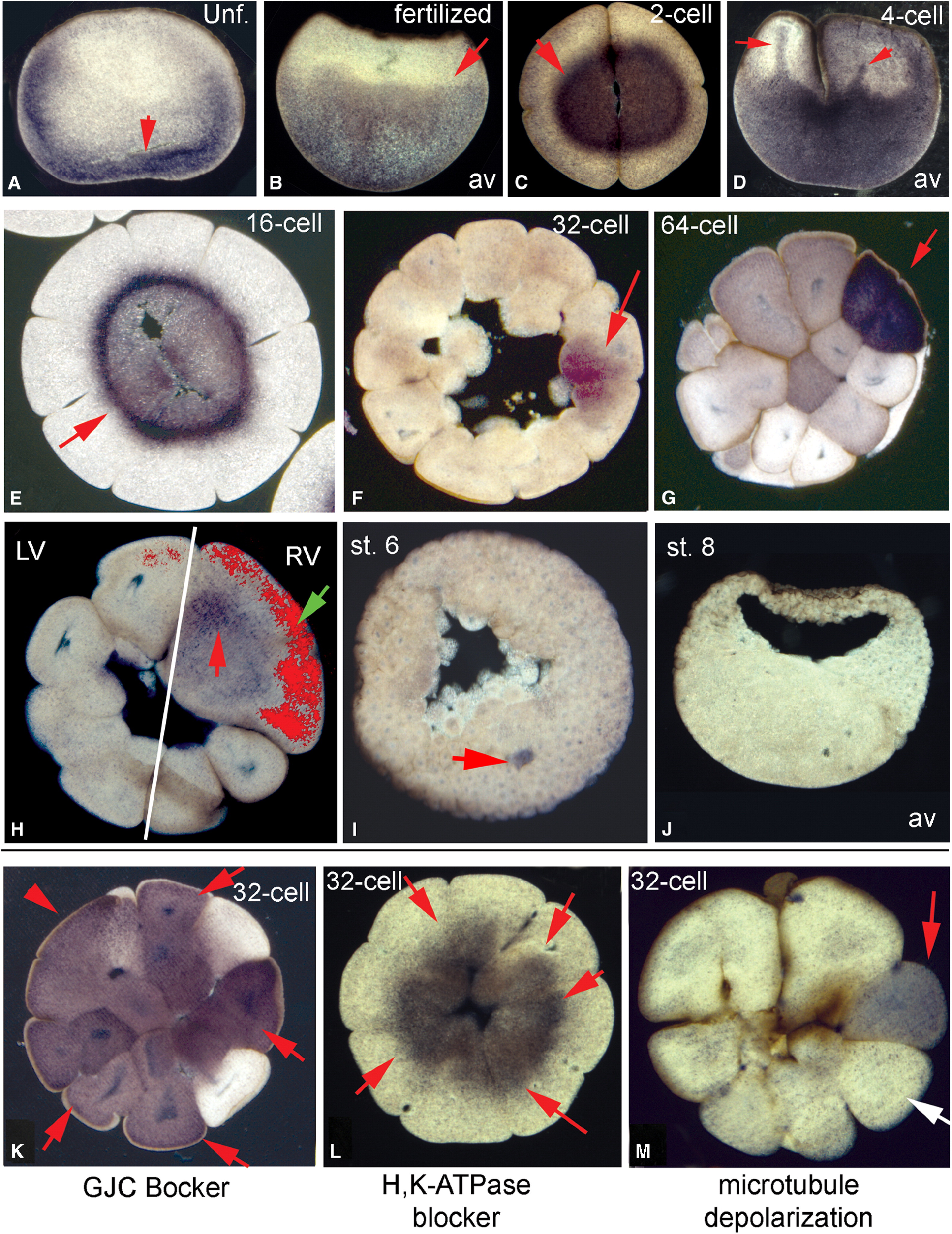 Frog embryos at various stages were fixed and sectioned for immunohistochemistry with an antibody specific for serotonin as previously described [33]. Red arrows indicate signal; white arrows indicate lack of signal. Panels show sections taken perpendicular to the animal-vegetal axis, except those marked with âavâ (B, D, and J), which were cut parallel to the animal-vegetal axis. In unfertilized eggs, maternal serotonin is localized circumferentially at the vegetal cortex (A). In fertilized eggs before cleavage, the serotonin is spread more than halfway toward the animal pole (B). The distribution of serotonin is symmetrical in the cytoplasm of blastomeres at the 2-cell stage (C). By the 4-cell stage, dynamic finger-like projections can be observed reaching from the pool of 5-HT in the vegetal half of the embryo toward the animal pole (D). During subsequent cleavages, serotonin is localized in a ring-like pattern (E). As cleavage proceeds, serotonin signal becomes weaker and is progressively confined to a specific subset of blastomeres at the 32- and 64-cell stages (F and G). Analysis of embryos lineage labeled with rhodamine-dextran (green arrow) in the right-ventralblastomere at the 4-cell stage reveals that the serotonin signal becomes restricted to the rightventral cells (H; white line indicates midline; LV, leftventral; RV, rightventral). By stage 6, 5-HT is no longer detected by immunohistochemistry (I and J). In embryos exposed to blockers of gap junctions, serotonin did not localize to specific blastomeres and exhibited a diffuse pattern in several blastomeres (K). In embryos in which H+/K+-ATPase activity was abrogated, serotonin likewise did not localize but remained symmetrically distributed (L). Exposure of embryos to nocodazole did not affect the ability of serotonin to localize to specific blastomeres (M).