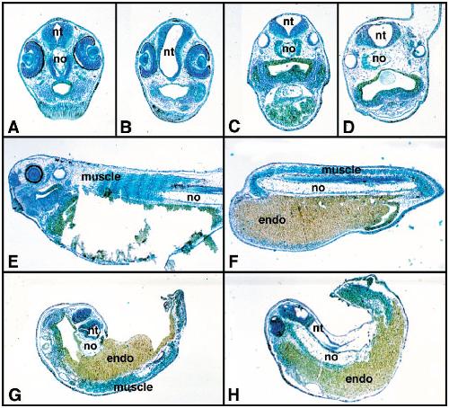 37-injected (B,D) embryos through the level of the eye (A, B) and otic vesicle (C,D). Note absence of notochord (no) in B, and misshapen