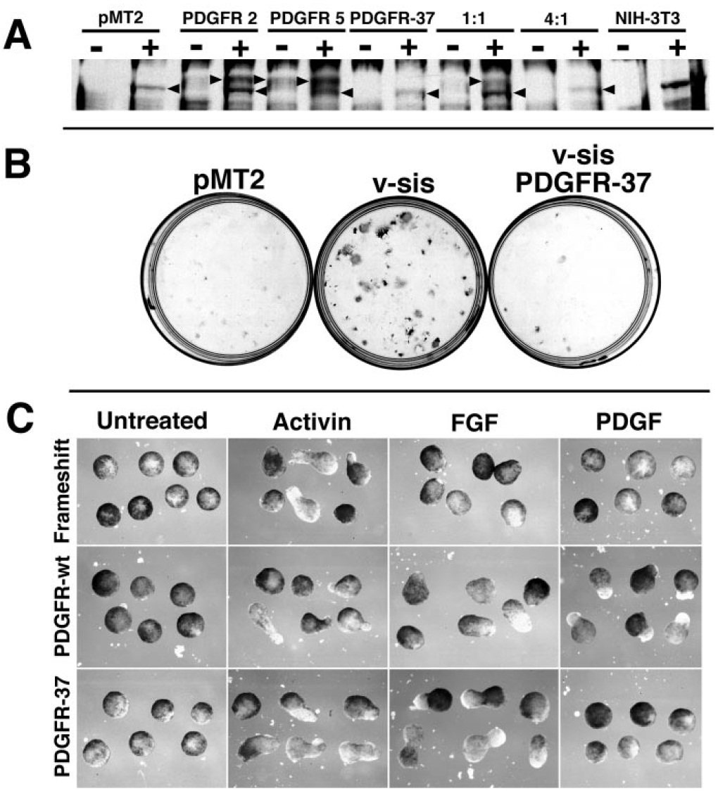 assessed 14 days after transfection. Note that v-sis-dependent colony formation was inhibited by co-transfection of PDGFR-37. (C) Xenopus