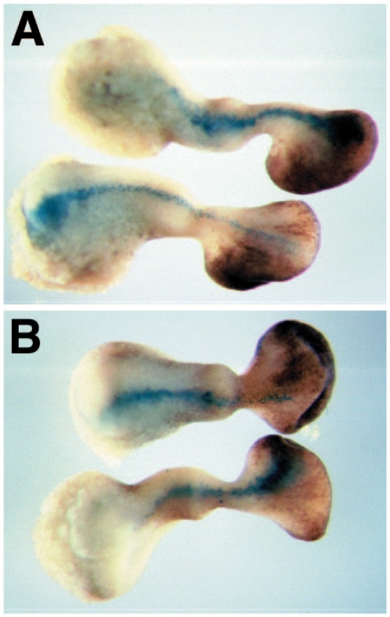 left of figure) by the convergently extended mesoderm. X-gal-stained