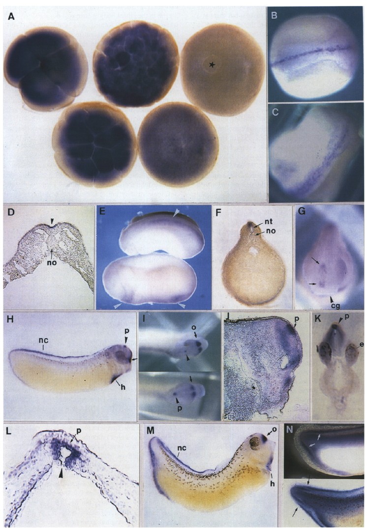 Fig. 3. Whole mount in situ hybridization (BMP-2) of Xenopus embryos. Xenopus albino embryos were hybridized with a digoxygenin labelled BMP- 2 antisense RNA derived from a 737 bp Sac IlPst I fragment and processed as described in Section 4. (A) From left to right: four-cell (st. 4), 32-cell (St. 6). morula (St. 7), blastula (St. 8.5) and gastrula (st. 11.5) stage embryos. Asterisk denotes the blastoporus. (B) Late neurula (St. 19) (dorsal view). (C) St. 21 (dorsal view). (D) Transverse section (30µm) through stage 17 embryo. The arrowhead points at staining in the dorsal midline. (E) St. 22/23 embryos. Arrowheads denote staining in the dorsal midline (upper) and in anterior and posteriormesoderm (lower). (F) Transversal section (100�m) (trunk region) through a St. 24 embryo. (G) St. 24, anterior view. Arrows denote intense staining at two frontal loci. (H) St. 28 embryo. The arrow points at the olfactory placode. (I) St. 28 embryos, frontal view. Note staining of the pineal body and of the olfactory placodes. (J) Parasagittal section through st. 28 embryo. (K) Anterior transversal section (100µm) according to the arrow in (I) through st. 30 embryo. (L) Higher magnification of an anterior transversal section (30µm) showing the mushroom-shaped pineal body and its communication to the third ventricel (arrowhead). (M) St. 32 embryo. (N) Magnification of the tailbud regions of St. 29 (top) and st. 33 (bottom) embryos. The arrows point at the disintegration of neural crest cells. cg: cement gland; e: eye anlage; h: heart anlage; nc: neural crest; no: notochord; nt: neural tube; o: olfactory placode; p: pineal body.