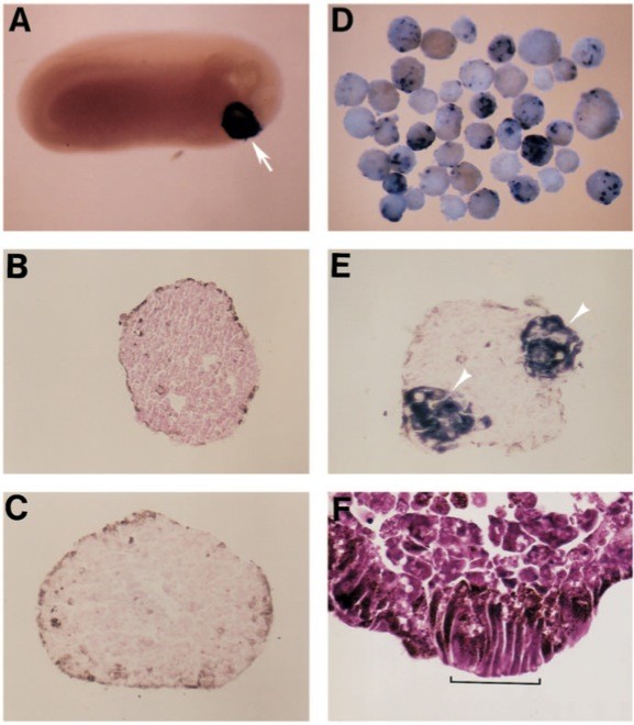 Fig. 5. Cement gland induction in animal cap explants from X- bhh-injected embryos. (A) Uninjected tailbudembryo stained for expression of the cement gland marker XAG-1 by in situ hybridization (white arrow). (B) Histological section of a stage 25-equivalent animal cap explant from an uninjected embryo stained for XAG-1. (C) Histological section of stage 25-equivalent animal cap explant from a lacZ mRNA- injected embryo stained for XAG-1. (D) Animal caps from X-bhh-injected embryos, cultured until siblings reached stage 25 and stained for XAG-1. (E) Histological section of one of the explants shown in D demonstrating foci of cement gland formation (white arrowheads). (F) Histological section of a X-bhh-injected animal cap showing the densely packed columnar morphology characteristic of cement gland secretory cells (bracket).