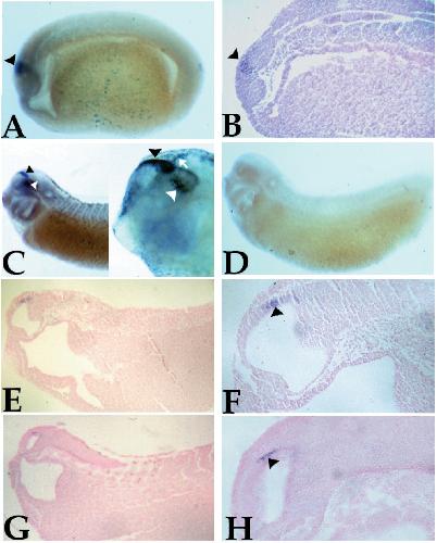 prospective prosencephalon and mesencephalon (arrowheads). (C) Low (left side) and high (right side) magnification views of whole tailbud