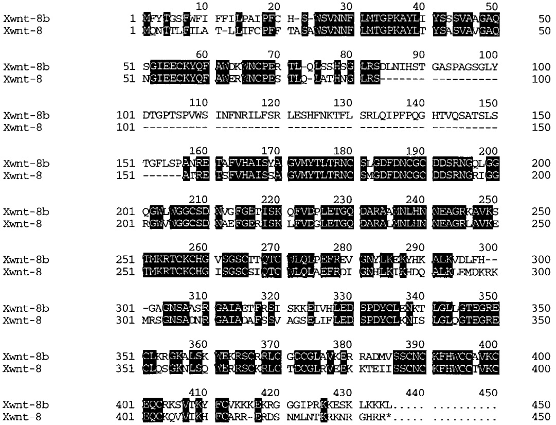 Fig. 1. Comparison of predicted Xwnt-8b and Xwnt-8 protein sequences. Gaps introduced to