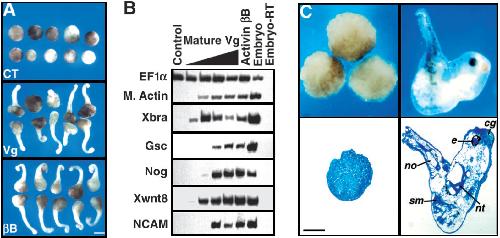are additional positive and negative controls. (C) Induction of embryoids by mature Vg1. Blastula animal pole explants treated with a high dose