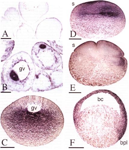 gastrula (stage 10). Dorsal lip of the blastopore is on the lower right marginal zone. Scale bars in A, B, 50 Jlm; C-F, 250 .urn. gv, germinal vesicle;