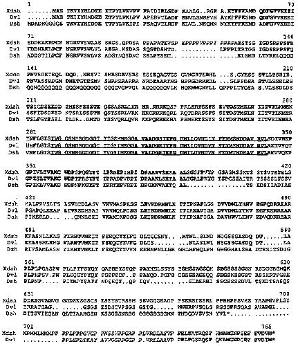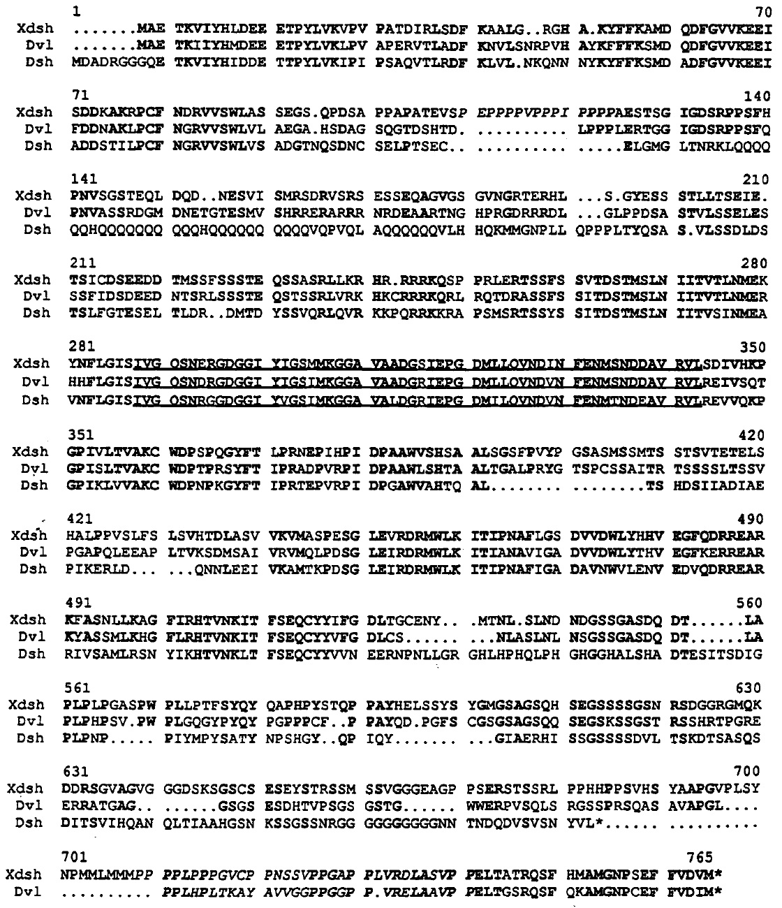 dsh homolog (Dvl) proteins. The Xdsh ORF starts with the first available methionine and encodes a