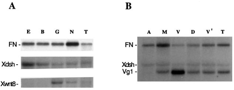 Fig. 2. Xdsh transcripts are present maternally and are equally distributed in different regions of the early blastula. Total RNA isolated from embryos at different developmental stages or from embryonic explants was analyzed by Northern blotting with specific antisense RNA probes. (A) Expression of Xdsh during embryogenesis: E, fertilized eggs; B, stage 7 blastulae; G, stage 11 gastrulae; N, stage 15 neurulae and T, tailbud embryos. (B) Spatial distribution of the Xdsh transcripts in stage 7 blastulae. Explants were isolated from A, animal; M, marginal; V, vegetal; D, dorsal; V¢, ventral regions; T, RNA prepared from whole embryos. Two embryo equivalents of total RNA were loaded per each lane. FN, Xwnt8 and Vg1-specific probes were used as controls. Fibronectin RNA (FN) is a control for loading. Xwnt8 transcripts are known to appear only after the midblastula transition (Christian et al., 1991). Vg1 RNA is a vegetally localized maternal mRNA (Rebagliati et al., 1985).