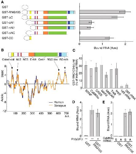 Figure 4. RNG105 binds directly to mRNAs in vitro. A, Recombinant GST-RNG105 deletion mutants were incubated with RNAs isolated from rat hippocampus. RNAs bound to the recombinant proteins were extracted and quantified. δC, Deletion of C terminus (from RGG box to C-end); δN1, deletion of N terminus (from N-end to coiled-coil region); δN2, deletion of N terminus (from N-end to NLS); δNC, deletion of N and C termini (from N-end to coiled-coil region and from RGG box to C-end); CC, coiled-coil region. B, Acidity-basicity analysis of human and Xenopus RNG105. Scores of +1, +0.5, and -1 were given to Lys and Arg, His, and Asp and Glu, respectively. The sum of the scores of 21 aa (residues X -10 to X +10) is plotted against a residue number X. Arrows denote clusters of basic residues. NES, Nuclear export signal. C, Indicated RNAs bound to GST-RNG105 in A were analyzed by semiquantitative RT-PCR. The ratio of the GST-RNG105-bound RNA compared with the input amount of the RNA is shown. Impβ, Importin β. D, Recombinant proteins were incubated with the hippocampal RNAs in the presence or absence of poly(dT), and RNAs bound to the recombinant proteins were quantified. E, Recombinant proteins were incubated with sense (S) or antisense (A) CaMKIIα mRNA, which had been transcribed in vitro. Bound RNA was quantified. Error bars represent SEM. |