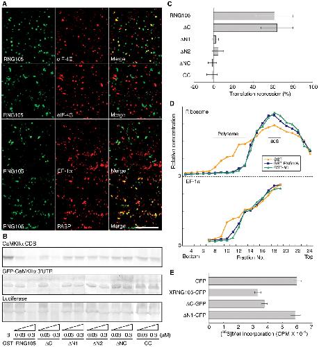 Figure 5. The RNA granule is translationally arrested, and RNG105 negatively regulates translation. A, Rat hippocampal slices were immunostained with anti-RNG105 antibody (green) and costained with anti-eIF-4E, anti-eIF-4G, anti-EF-1α, or anti-PABP antibody (red). Dendritic areas are shown. Merge, Merged image. Scale bar, 10 μm. B, RNG105 inhibits translation in vitro. The CaMKIIα CDS, GFP-CaMKIIα 3â²UTR, and luciferase mRNAs were translated in the presence of indicated recombinant proteins in rabbit reticulocyte lysates and detected by SDS-PAGE. CC, Coiled coil. C, The bands in B were quantified, and translational repression activity of each recombinant protein (0.3 μM) was calculated. Data are means ± SE of translational repression of the three mRNAs by the recombinant proteins. D, The lysates incubated with the recombinant proteins (0.3 μM) in B were fractionated by sucrose density gradient centrifugation. Elution profiles of ribosomes and EF-1α are shown. E, RNG105 inhibits translation in vivo. A6 cells expressing XRNG105-GFP, δC-GFP, δN1-GFP, or control GFP were labeled with [35S]methionine for 10 min and then proteins were isolated from the cells by TCA precipitation. Incorporation of [35S]methionine ([35S]met) into newly synthesized proteins is shown. CPM, Counts per minute. Error bars represent SEM. |