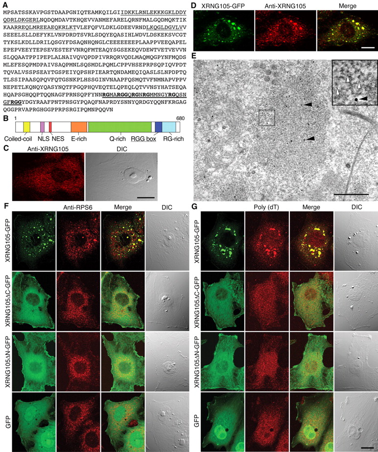 Figure 1. RNG105 is a novel protein with an RNA-binding motif and promotes the organization of cytoplasmic granules containing ribosomes and mRNAs. A, Predicted amino acid sequence of XRNG105. Solid line, Coiled-coil domain; dotted line, NLS; double line, nuclear export signal (NES); wavy line and bold letters, RGG box, an RNA-binding motif. B, Schematic diagram of XRNG105. E-rich, Glutamic acid-rich region; Q-rich, glutamine-rich region; RG-rich, arginine- and glycine-rich region. Other regions are described in A. C, Immunostaining of A6 cells with anti-XRNG105 antibody. Right, Differential interference contrast (DIC) image. Scale bar, 10 μm. D, A6 cells expressing XRNG105-GFP were stained with anti-XRNG105 antibody. Scale bar, 10 μm. Merge, Merged images. E, Immunoelectron microscopy of A6 cells expressing XRNG105-GFP stained with anti-XRNG105 antibody. Spots of immunogold (black arrowheads) are seen in a ribosome-rich area (â¼1 μm in diameter) in the cytoplasm. White arrowheads denote ribosomes (inset). Scale bar, 500 nm. F, G, A6 cells expressing XRNG105-GFP, XRNG105δC-GFP, XRNG105δN-GFP, and GFP were stained with anti-RPS6 antibody (F) or stained by in situ hybridization with poly(dT) for mRNA detection (G). The right panels are DIC images. Scale bar, 10 μm. |