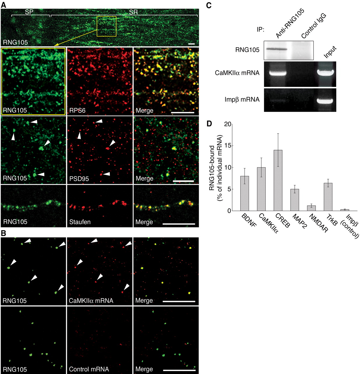 Figure 3. RNG105-localizing granules exhibit features common to RNA granules in neuronal dendrites. A, Rat hippocampal slices (top and middle) or cultured hippocampal neurons (bottom) were immunostained with anti-RNG105 antibody (green) and costained with anti-RPS6, anti-PSD-95, or anti-staufen antibodies (red). Dendritic areas are magnified and shown. Arrowheads denote colocalization. Merge, Merged images; SP, stratum pyramidale; SR, stratum radiatum. Scale bars, 10 μm. B, Rat hippocampal slices were immunostained with anti-RNG105 antibody (green) and costained by in situ hybridization with probes for CaMKIIα mRNA or control probes (CaMKIIα sense RNAs) (red). Dendritic areas are shown. Arrowheads denote colocalization. Scale bars, 10 μm. C, Rat hippocampal extracts were subjected to immunoprecipitation (IP) with anti-RNG105 antibody or control IgG. Precipitants were analyzed for RNG105 by Western blotting and for CaMKIIα mRNA and control importin β (Impβ) mRNA semiquantitatively by RT-PCR. D, Indicated mRNAs precipitated with RNG105 were analyzed by semiquantitative RT-PCR as in C. The ratio of the RNG105-bound mRNA compared with the input amount of the mRNA is shown. Error bars represent SEM. |